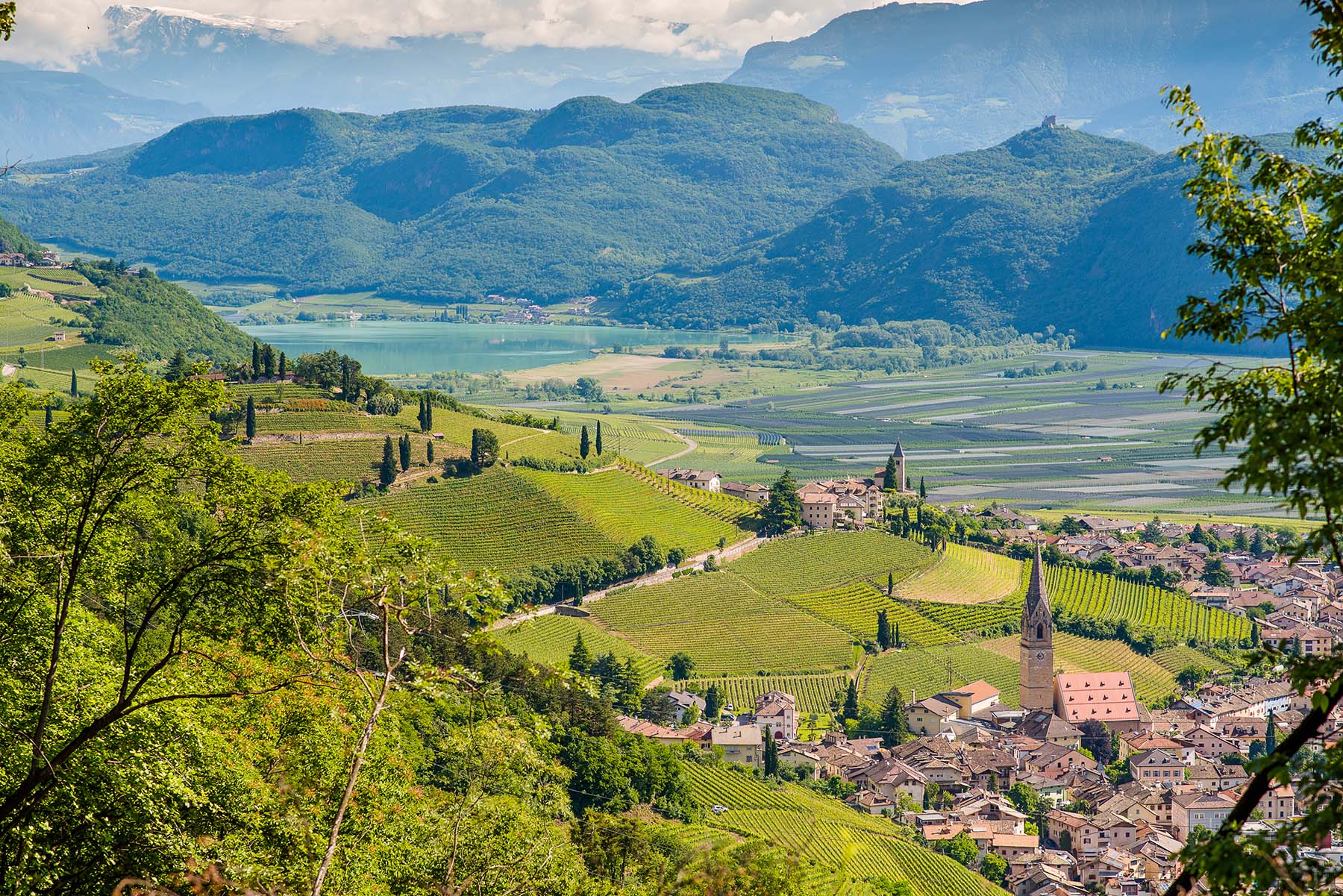 Das verbindende Element dieser einzigartigen Region ist der Kalterer See. Er liegt eingebettet zwischen Weinbergen, Zypressen, Olivenbäumen und Palmen, während im Hintergrund die alpine Bergwelt thront.