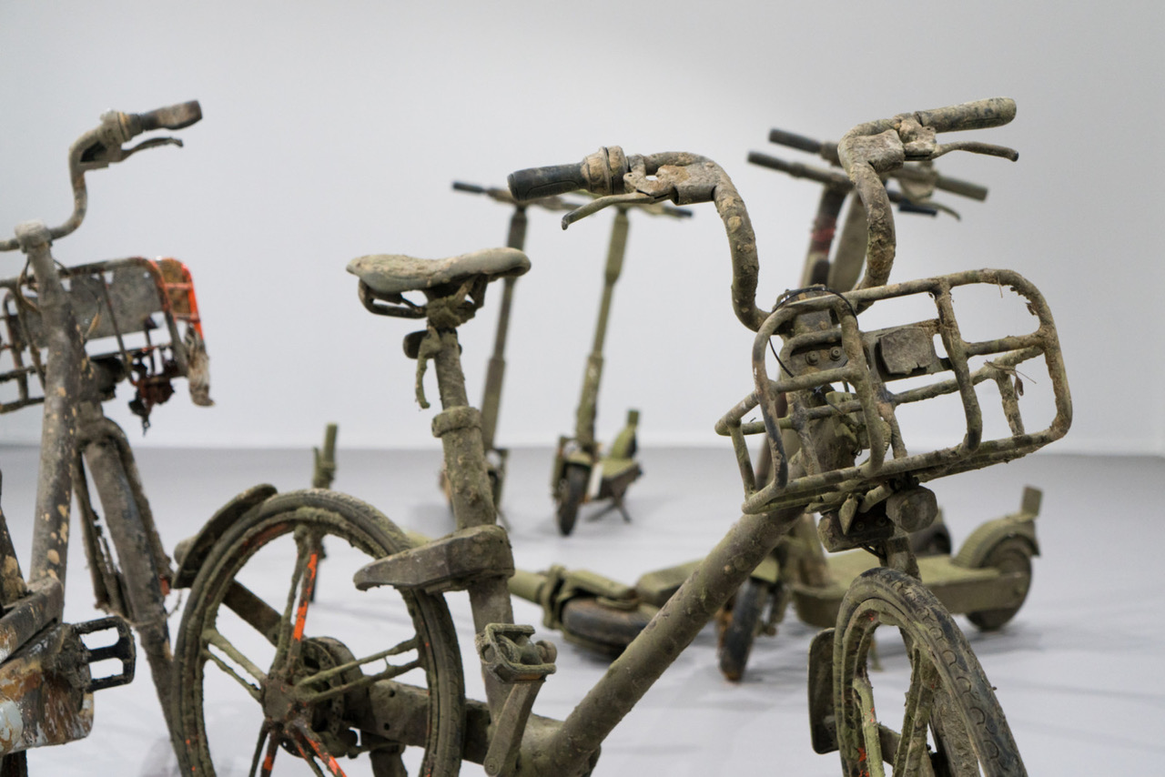 Ihr neues Gewand verdanken die Sharingbikes der Tatsache, dass sie ob der eigenen Flut im Stadtraum und der billigen Bauweise immer wieder Opfer werden von Frustration oder Zerstörungswut. Und unter anderem in der Spree versenkt werden. Vom Grund gefischte Velos und Trottis werden von Aram Batholl als Kunstwerke inszeniert und ausgestellt.