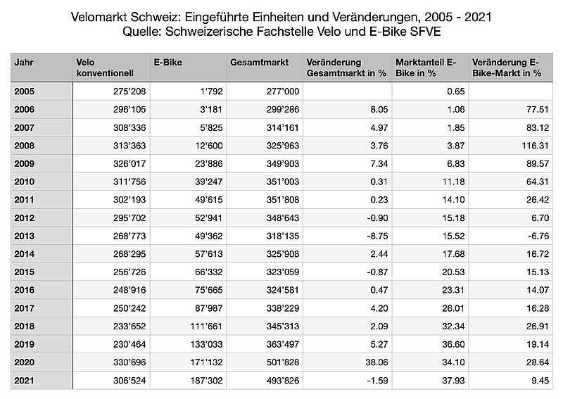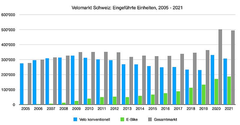 Bemerkenswert ist, dass sich nach den ersten beiden Quartalen des Jahres 2021 trotz eher bescheidenem Wetter noch ein weiteres Wachstum des Velomarkts abgezeichnet hatte. Diese Tendenz wurde in der zweiten Jahreshälfte ausgebremst: Das Wachstum bei E-Bikes fiel über das ganze Jahr betrachtet schwächer aus und das Wachstum bei den konventionellen Velos verkehrte sich bis Ende Jahr sogar in eine Abnahme. Der Grund dafür lag bei der schlechten Warenverfügbarkeit und nicht bei einer sinkenden Nachfrage.
