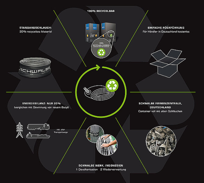 Mit der Schweiz bietet Schwalbe den Recyclingprozess für Veloschläuche bereits im fünften europäischen Land an. Die Idee ist genau so einfach wie effizient: Zuerst werden alte Veloschläuche jeglicher Hersteller gesammelt und anschliessend in grösseren Mengen und koordinierten Fahrten via Deutschland zum Produktionswerk in Indonesien gebracht.
