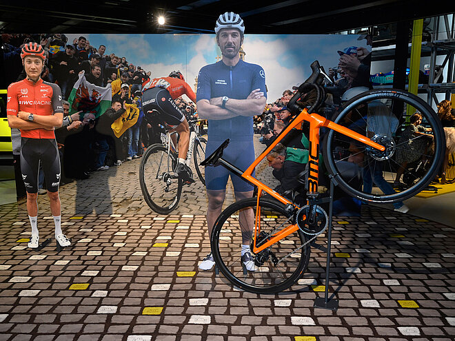 Zudem lädt ein Fahrtwindsimulator dazu ein, sich in einen Radprofi hinein zu versetzen – wahlweise in den Modi Cruising, Zeitfahren und Sprint.