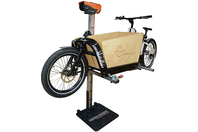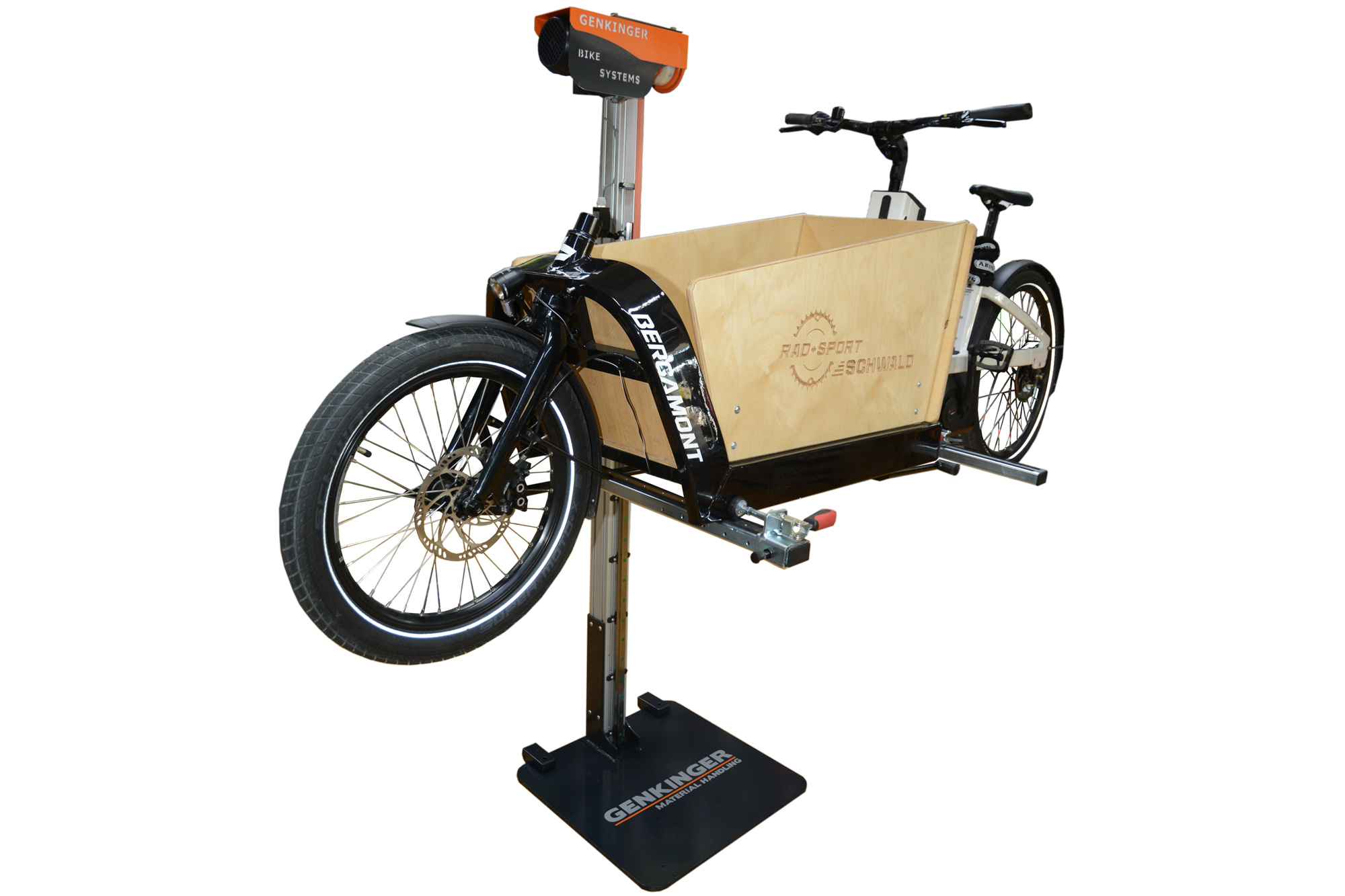 Dieser elektrische Doppellift ist platzsparend, hat einen Hubbereich von 2 Meter bei einer Bauhöhe von 2.2 Meter und wird entweder im Boden verschraubt oder steht frei auf einer Platte. Beim Haltesystem hat man die Wahl zwischen gängigen Klemmen, 3-Punkt-Aufnahmen, einer Gabelzinke für Lastenfahrräder oder einem Spreizkonus für das Sattelrohr (abgebildet).