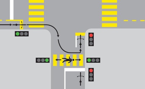 Die Idee ist, dass Velofahrende am rechten Fahrbahnrand zu bleiben und das heikle direkte Linksabbiegemanöver im rollenden Verkehr zu vermeiden können. Die Möglichkeit für das indirekte Linksabbiegen ist signalisiert. Velofahrende, die links abbiegen möchten, bleiben also am rechten Fahrbahnrand, während sie auf die Kreuzung zufahren und diese zur Hälfte queren. Auf der von rechts einmündenden Strasse ist vorne eine spezielle Fläche markiert, auf welcher Velofahrende anhalten, abdrehen und warten können. Sobald das Lichtsignal auf grün schaltet, kann die Kreuzung dann erneut geradeaus gequert werden.