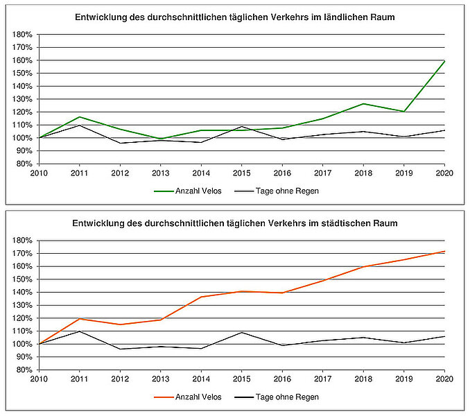 Während die Zunahme des Veloverkehrs im städtischen Raum einem langjährigen Trend entspricht, scheint die starke Zunahme im ländlichen Raum von der Pandemie beeinflusst zu sein. (Grafik: Schweiz Mobil)