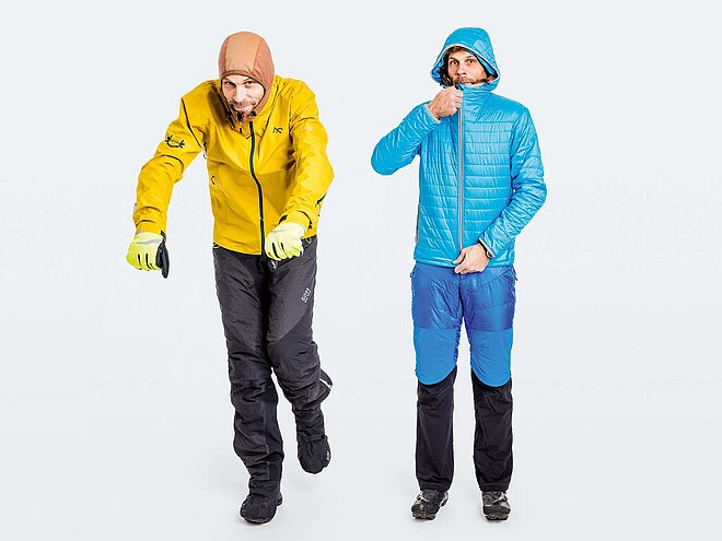 Kunstfasern transportieren dafür den Schweiss besser nach aussen, sie sind leichter und trocknen schneller (ein Vorteil, wenn man unterwegs mal ein Leibchen auswaschen will). Praktisch sind zudem Schlauchtücher für den Hals. Sie können bei Bedarf bis über die Nase hochgezogen werden und halten die kalte Zugluft vom Gesicht ab.