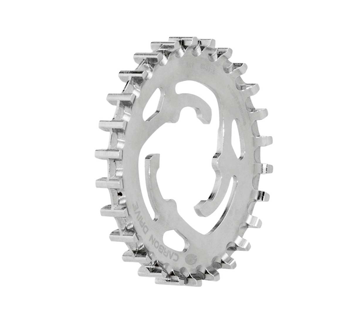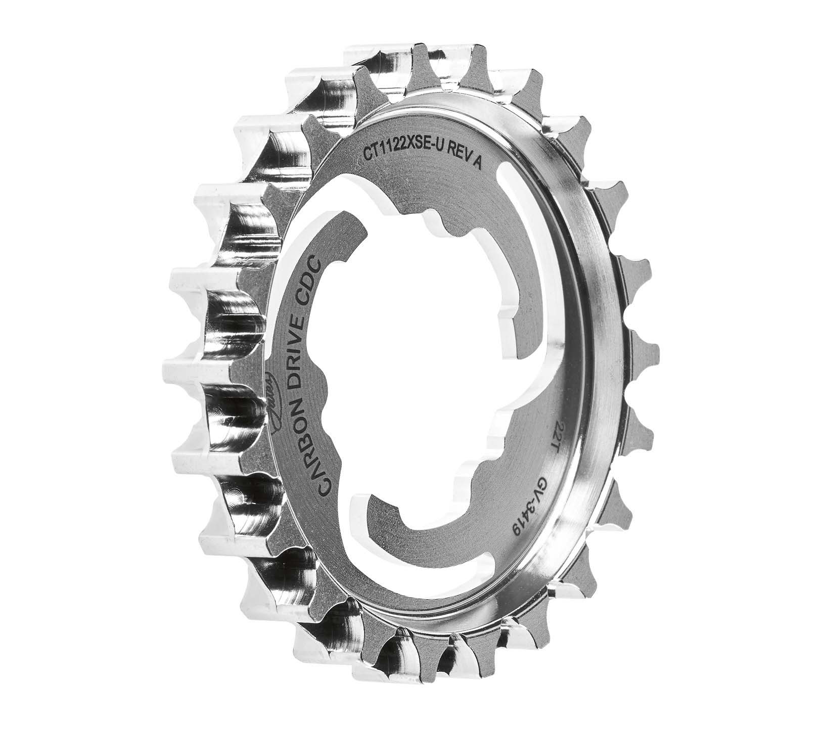 Carbonfaserverstärkter Kunststoffriemen, 12 mm breit, Teilung 11 mm, Zähnetiefe 5 mm, 10 unterschiedliche Längen. Shimano- und Enviolo-Nabenschaltungen, vordere Riemenscheibe aus Kunststoff, hintere Riemenscheibe aus verzinktem Stahl.