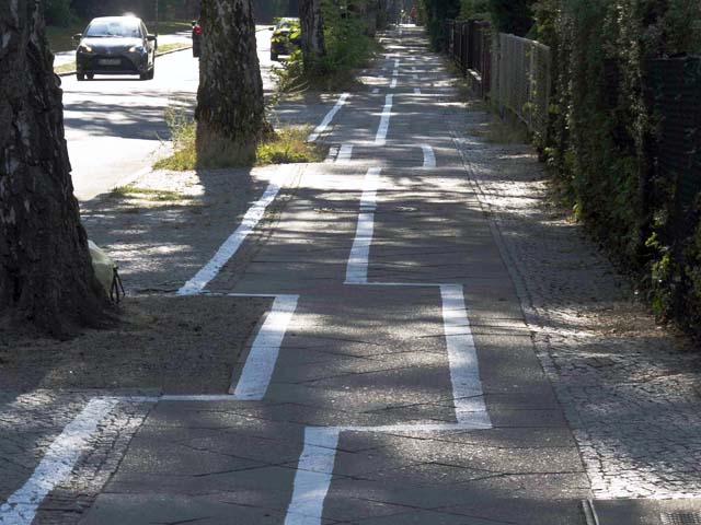 Anstatt in gerader Linie, führt der Veloweg etwa 200 Meter lang im Zickzack über einen Teil der Leo-Baeck-Strasse in Berlin. Die Markierung verläuft den Trottoir-Rand entlang und ist auf Höhe der Bäume jeweils versetzt. Wieso die mit der Ausführung beauftragte Baufirma den Weg so kunstvoll zeichnete, ist nicht bekannt.