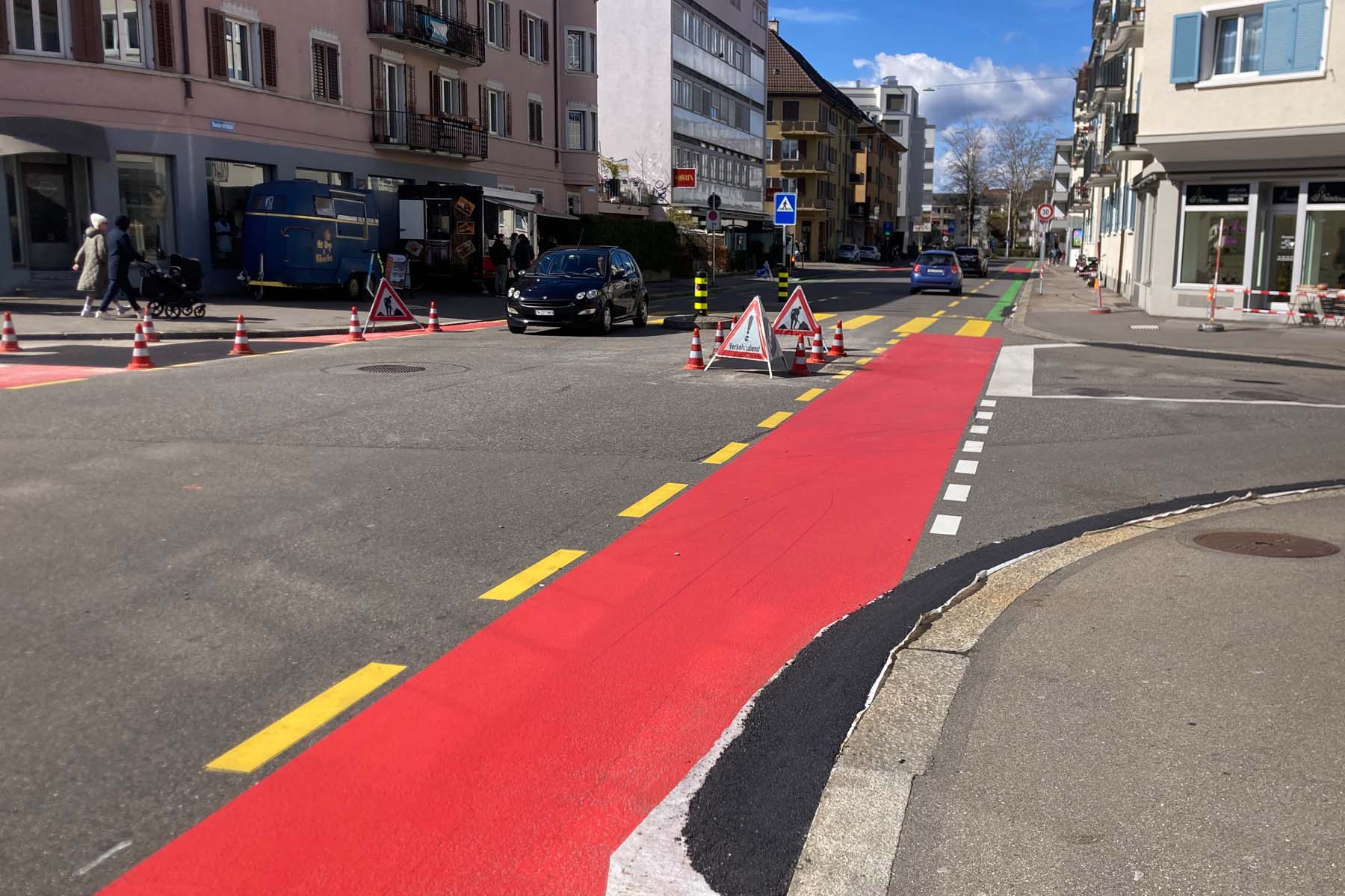 Die gut sichtbaren Flächen bei Kreuzungen und Einfahrten machen einen zufälligen Eindruck. Auch dort, wo die Route offiziell endet. Wie fahre ich weiter – etwa zum Bahnhof Altstetten oder an den Lindenplatz? Ausser Eingeweihten weiss das niemand.