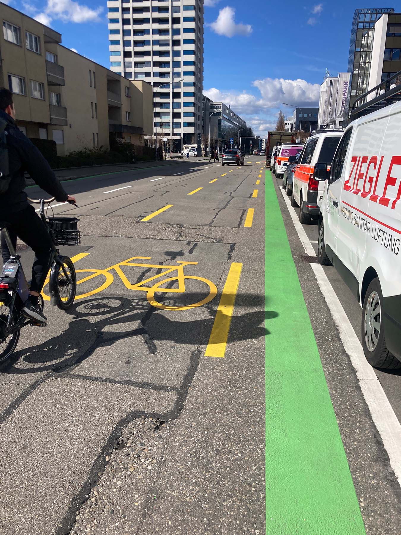 Die Begründung aus dem Tiefbauamt, man habe sich für ein «grünes Farbband entschieden», um die Velovorzugsroute zu signalisieren, ist hanebüchen und notabene in der Nähe zu parkierten Autos nicht nur brandgefährlich, sondern auch hinsichtlich der überdurchschnittlichen Verkehrsopfer auf dem Velo geradezu zynisch.