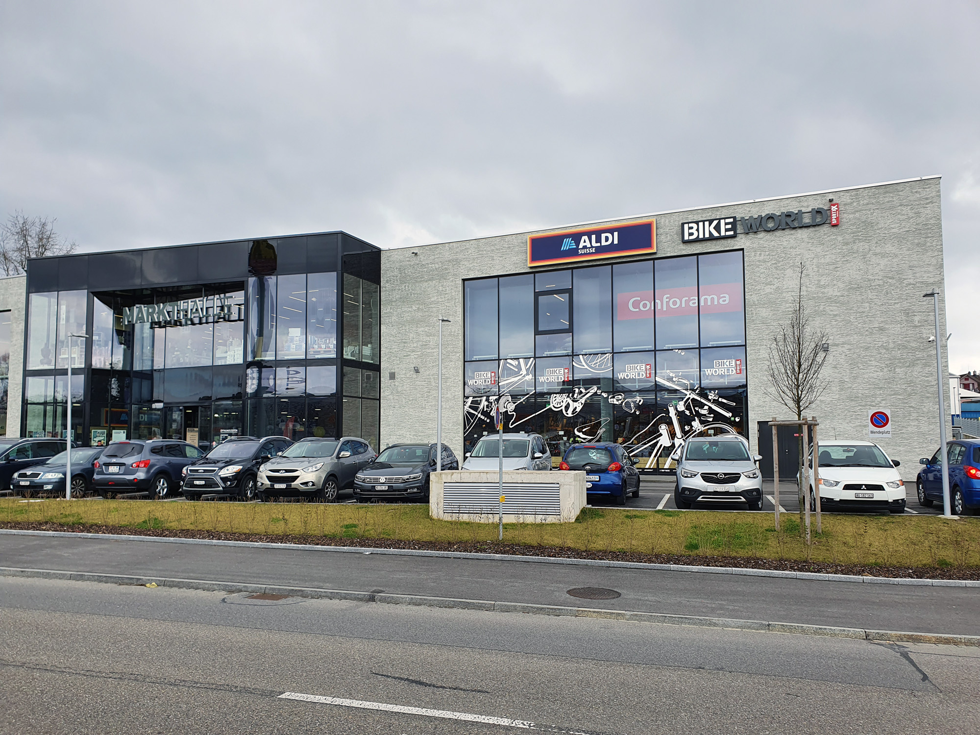 In Baden zieht die Bike World-Filiale in den Trafo-Komplex mit viel Laufkundschaft, in Affoltern am Albis lässt sich der Velogrossmarkt izwischen Industriegebäuden und Einkaufszentren nieder. Im Bild der Eingangsbereich der Filiale in Affoltern.