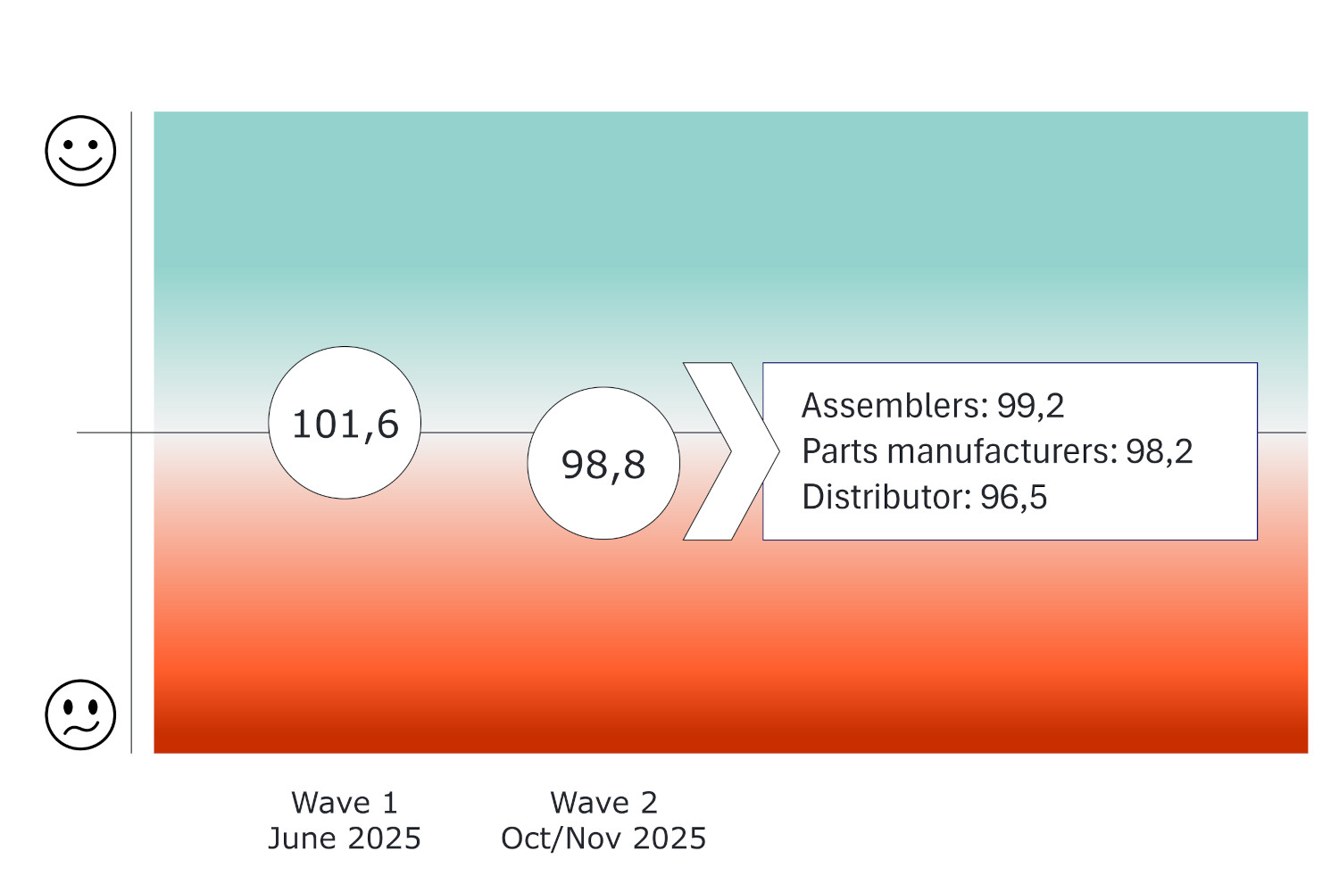 Die Befunde der zweiten Erhebung verdienen einen genaueren Blick. So sackte der Gesamtindex von 101.6 Punkten im Juni 2025 um fast drei Punkte auf 98.8 Punkte im Herbst ab. Dabei zeigten sich die Montagebetriebe noch deutlich zuversichtlicher als die Distributoren.