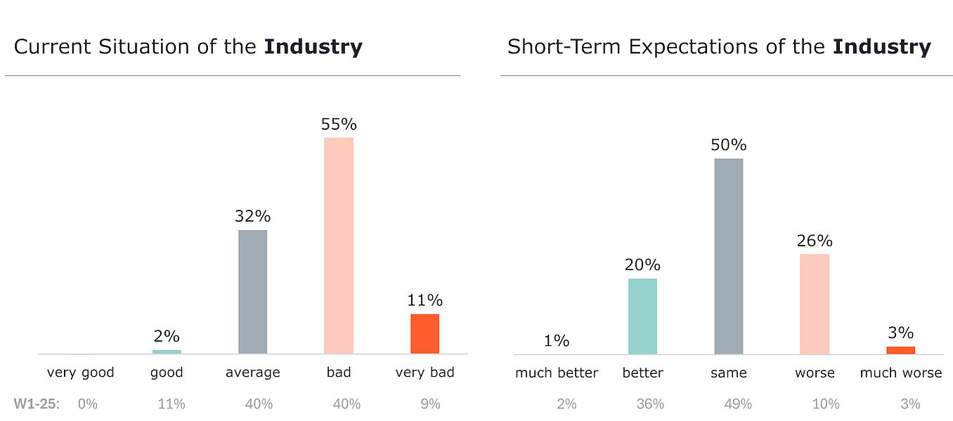 Optimistischer beurteilen die Entscheidungsträger den Zustand der eigenen Unternehmen: Hier antworteten je 29 Prozent mit schlecht oder sehr schlecht sowie mit gut oder sehr gut. Allerdings hat sich auch diese Einschätzung vom Juni bis zum Herbst deutlich verschlechtert.