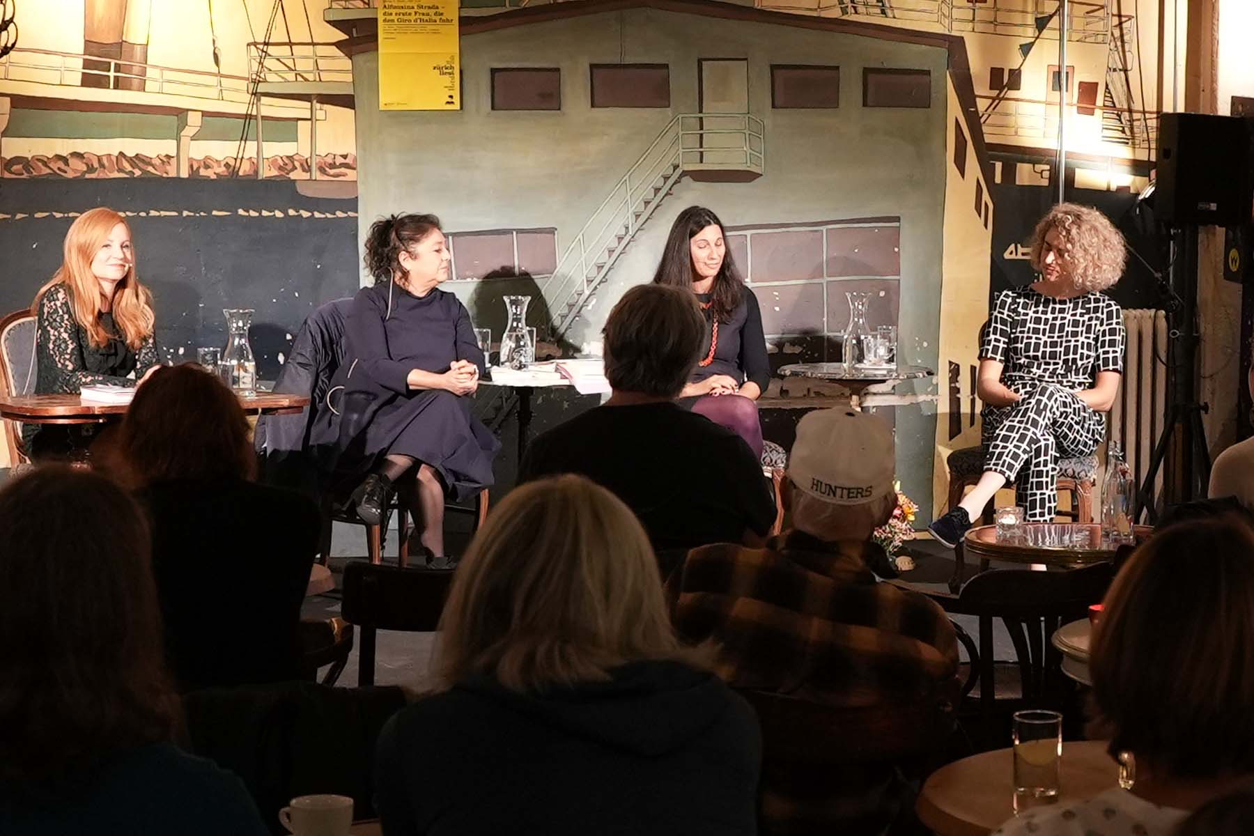 «Auf dem Podium ist ein Frauenquartett: die Autorin Simona Baldelli, die Schauspielerin Wanda Wylowa, die zweisprachige Moderatorin Laura Scuriatti und die Schweizer Radprofi Marlen Reusser.»