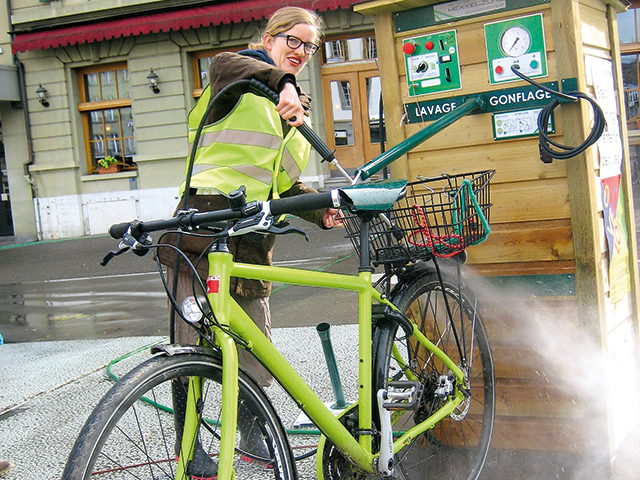 Die Velowaschanlage des Schweizer Anbieters Wexxelzone ist neben vielen anderen eine neue Möglichkeit für die Zusammenarbeit von Regionalverbänden und «bike to work». Die Velowaschanlage zeichnet sich laut Informationen des Anbieters durch ihren geringen Platz- und Wartungsbedarf aus. Beim ersten Anblick erinnert sie an ein kleines Gartenhaus aus Holz. Die Waschstation verfügt über eine Sattelfixierung für alle gängigen Sattelarten – so steht das Fahrrad während des Waschvorgangs sicher und aufrecht. Um die Zweiräder abzuspritzen, bietet die mobile Station einen fix angebrachten Schlauch mit einer Düse, wie man sie von Hochdruckreinigern kennt. Der Wasserdruck ist jedoch reduziert, sodass empfindliche Komponenten des Velos keinen Schaden nehmen (siehe auch «Frühlingsputz» in Velojournal 2/2014).