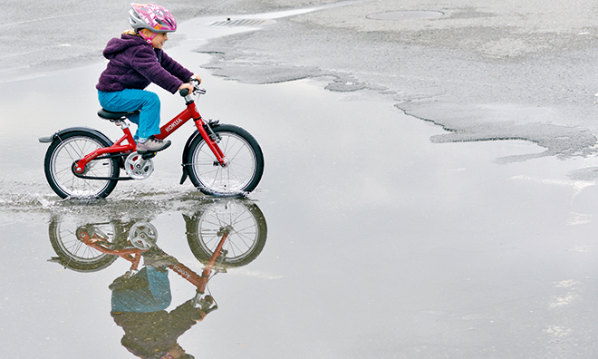 Doch das «Like to Bike» besticht nicht nur durch die schlaue Schaltung: Das Velo gehört mit 8,3 Kilo zu den leichteren auf dem Markt. Der Rahmen in Unisex-Form ist recht tief geschnitten, sodass sich die Kinder nicht im Schritt stossen können. Die Ausrüstung wurde zugunsten des Gewichtes auf ein Minimum reduziert: Ausgeliefert wird das Velo mit Ständer und dem cleveren «Chain Runner»-Kettenschutz. Dieser ist über die Kette gestülpt, dreht mit und ist dadurch leicht und dennoch sehr robust. Hosen und Hände sind bestens vor Verschmutzung geschützt, zudem muss die Kette weniger geölt werden.
