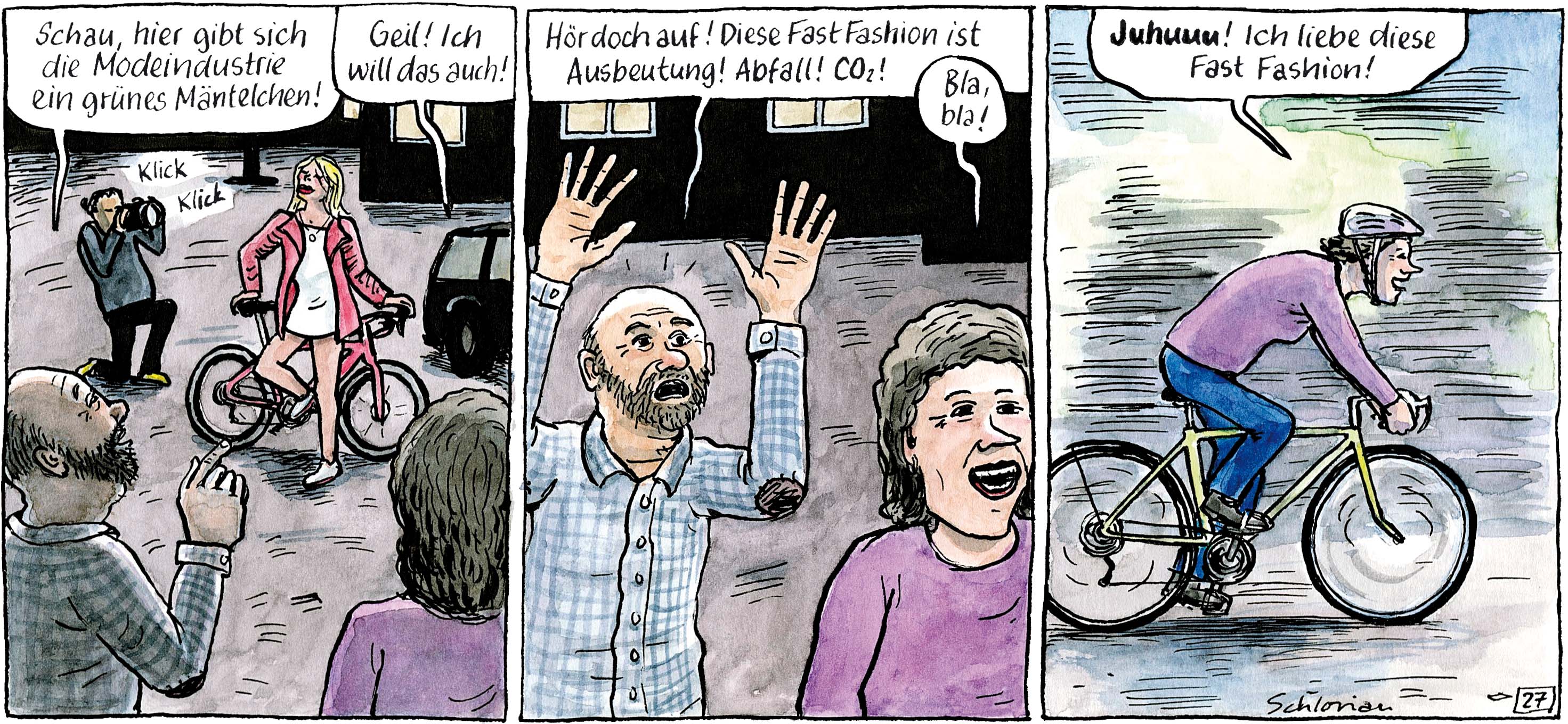 Fast Fashion und Greenwashing lassen Schlorian kalt. Lieber schnell mit dem Velo unterwegs.