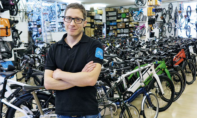 Das «Learning on the Job» und der Besuch der Berufsschule halbtags während dreier Jahre brachten es mit sich, dass aus Thomas Ernst letzten Sommer ein «richtiger» Velomechaniker wurde – mit eidgenössisch anerkanntem Abschluss. Seit Herbst bildet er auch einen Lehrling aus. Neben dem Verkauf wird auch für diesen Veloshop der Service immer wichtiger. Gerade E-Bike-Fahrende, die ihr Gefährt das ganze Jahr hindurch benutzen, brauchen das. Auch die milden Winter haben viel dazu beigetragen, dass sich das Velogeschäft immer mehr zu einem Ganzjahresgeschäft entwickelt. Im Gegensatz zu früher, als in den Wintermonaten im Handel Flaute herrschte. Hinzu kommt, dass E-Bikes im Vergleich zu einem alten Militärvelo komplexe Hightech-Geräte sind und bezüglich Wartung und Technik Anforderungen stellen, die näher bei einem Motorrad als bei einem «Velogöppel» liegen. Auch über die Modellpflege und Komponentenwechsel bei Stadtvelos, bei der Mechanik oder zum Beispiel bei den Stossdämpfern muss ein Fahrradmechaniker heutzutage Bescheid wissen. Die Mechaniker bei Velo Zürich mit ihrer grossen Modellpalette ganz besonders. Die Kunden schätzen die grosse Auswahl, die qualitativ hochstehende Palette sowie die unabhängige Beratung dank der Markenvielfalt. Sie sind auch bereit, 5000 Franken für ein E-Bike zu bezahlen. Damit spart sich ein Pendler oft einen Zweitwagen. Militärvelo-Kunden reisen übrigens am weitesten nach Zürich. Auch aus Deutschland, Italien und Spanien.