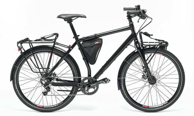 Ausstattung: Aluminiumrahmen, Aluminiumgabel, schwarz pulverbeschichtet, Shimano-«Alfine»-8-Gang-Nabenschaltung, hydraulische Scheibenbremse Magura «MT4», Nabendynamo Shimano «Alfine», LED-Scheinwerfer Bumm «Cyo», Rücklicht Bumm «D-Toplight-Line», Pneu Schwalbe «Marathon Plus Tour», eigens entwickelter Front- und Hinterradgepäckträger mit Spanngurten