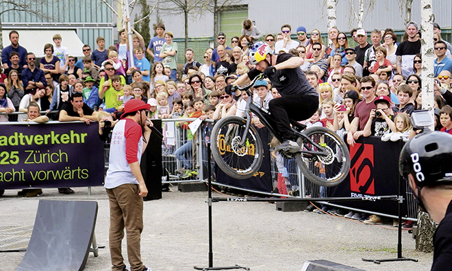 Mit Danny MacAskill darf das Urban Bike Festival zum zweiten Mal auf einen veritablen Zuschauermagnet zählen. Der weltbekannte Trial-­Star zog im vergangenen Frühjahr Scharen an. Nicht wenige der jüngeren BesucherInnen kamen wohl extra wegen ihres Idols nach Zürich. Doch auch die Erwachsenen erfreuten sich an den Shows. Und so verwandelte MacAskill den Turbinenplatz in ein regelrechtes Tollhaus.