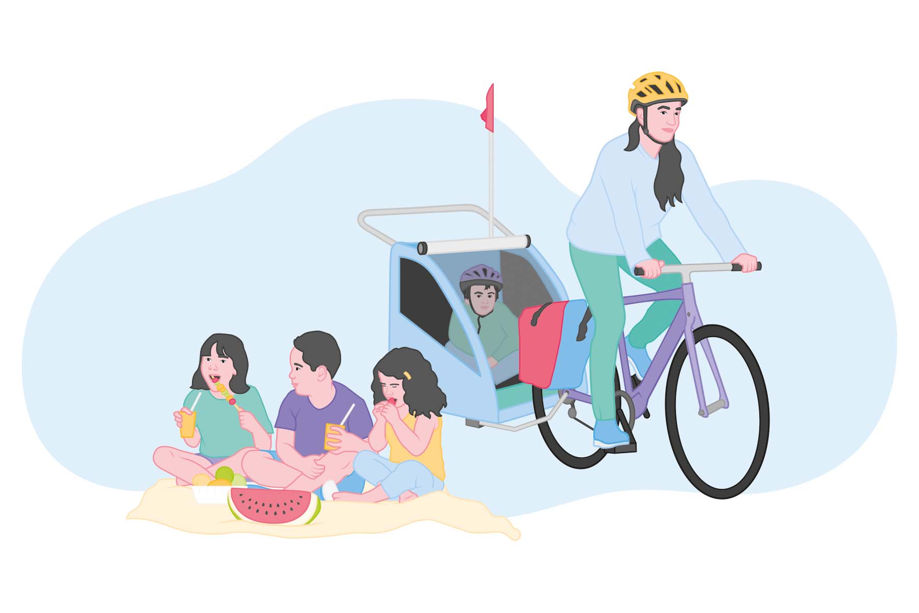 Planen Sie alle 15 bis 20 Kilometer eine kindgerechte Pause mit Spielmöglichkeit, damit die Fahrt für alle entspannt bleibt. Genügend Snacks und Wasser  einpacken. Velofahren macht hungrig und durstig.