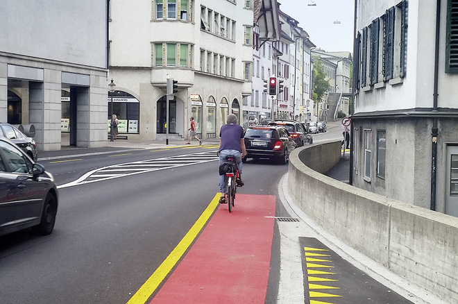 Dabei ist der Strassenabschnitt gerade erst renoviert worden. Die Markierungen leuchten noch frisch auf dem Asphalt. Der Radstreifen glänzt rot und zeigt Motorfahrzeuglenkern an, dass hier auch Velos Platz haben. Doch die Markierung hört genau dort auf, wo die gefährliche Strecke anfängt. Kurz vor dem Fussgängerstreifen wird die Strasse schmal. Die Sperrfläche vor der Mittelinsel verengt die Spur. Auto- und Velofahrende fänden unmöglich nebeneinander Platz, erläutert Steinacher. So komme es unweigerlich zu heiklen Situationen: rechts eine Betonmauer, links Lastwagen und Autos. Und ein Velostreifen, der sich just an dieser Stelle in Luft auflöst.