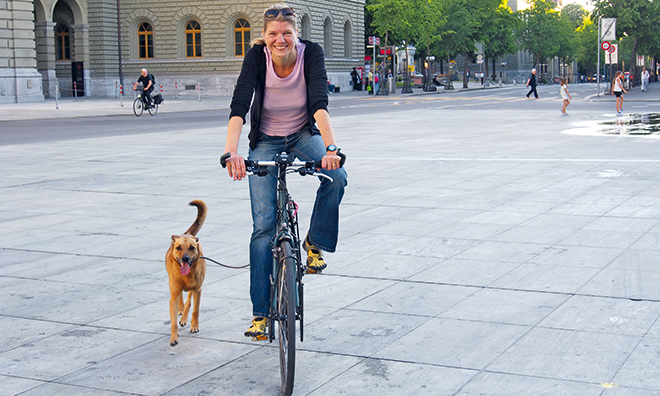 «Ich bin die grosse dünne Blonde mit Hund und Velo», erklärte Maxi Kutschera. Man könne sie also selbst am Bahnhof Bern nicht übersehen. Und so ist es dann auch. Ihr Velo ist ein Herrenrad mit hohem Rahmen, von einem Noname-Hersteller: «Es steht nichts drauf. Mein Mann hat es an der Velobörse für sich selbst gekauft. Ich sagte: No, das ist meins!» Seither braucht sie es vor allem für die Touren, die sie mit ihrem Partner Urs fährt. Wegen ihm ist sie in die Schweiz gezogen – aber dazu später.