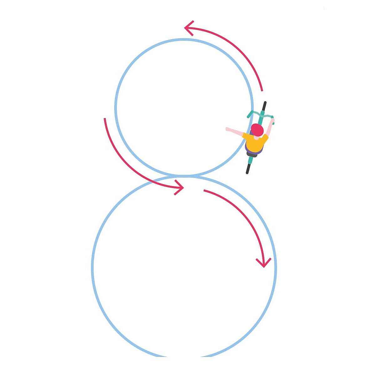 Um Kurven zu üben, können Kinder auf Kreisen eine Acht fahren und versuchen, immer auf der Linie zu bleiben. Klappt das gut, kann versucht werden, möglichst langsam im Kreis zu fahren.