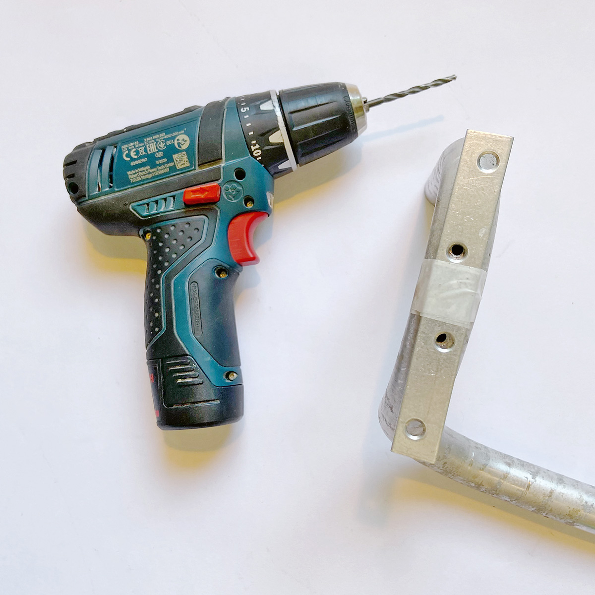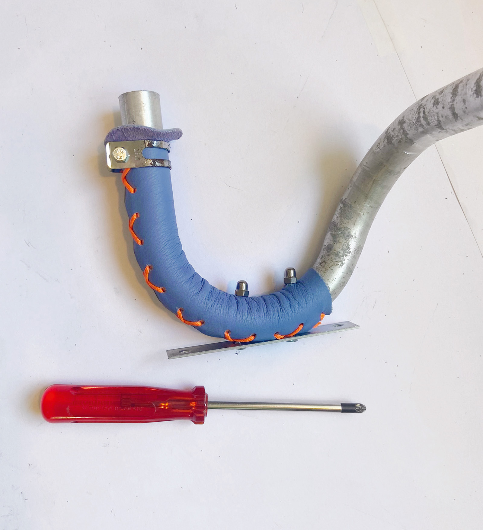Mit der Ahle Leder auf Höhe der vorgebohrten Löcher im Lenker durchstossen. Verbindungsbleche mit den Senkkopfschrauben und den Hutmuttern am Lenker befestigen. Rondellen platzieren. Bremshebelschellen unterhlab der Rondellen festschrauben.