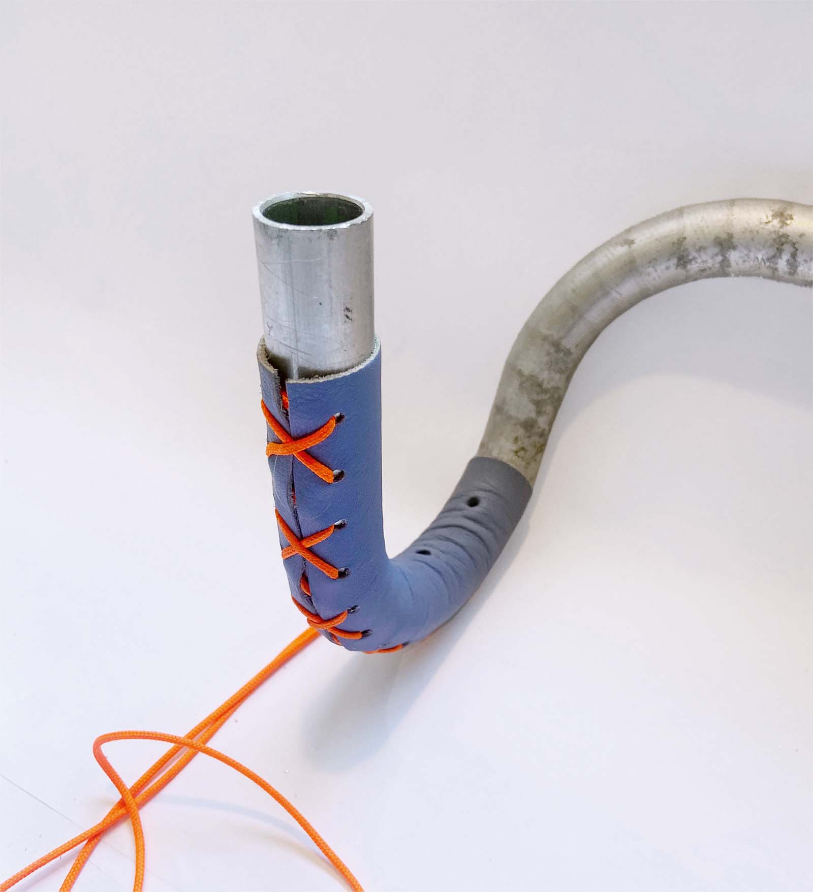 Den Lenker mit Lederstreifen überziehen. Die durchgefädelte Kordel jeweils gut anziehen. Hier gehts zur DIY-Anleitung wie Velolenker überzogen werden können.