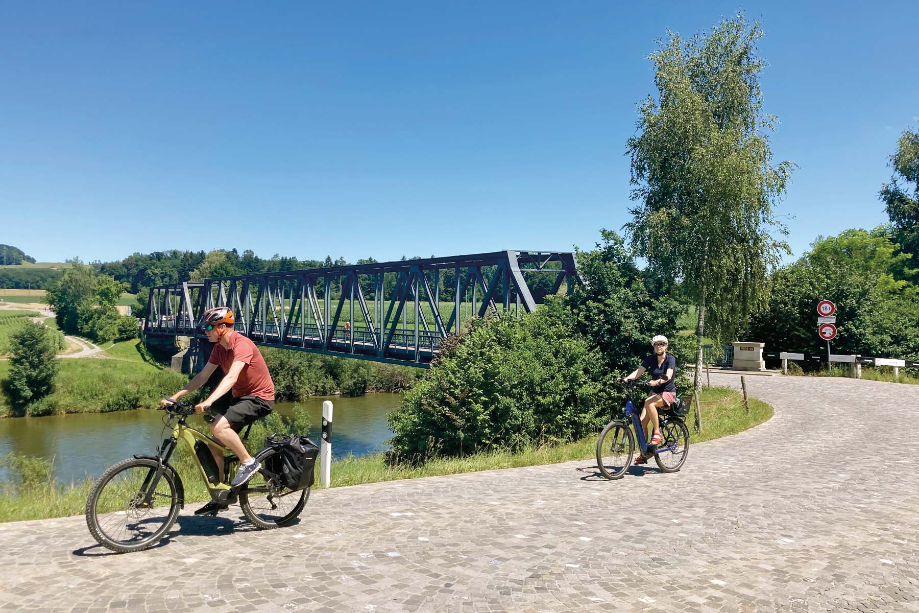 In rasanter Fahrt geht es weiter nach Thalheim und dann auf dem leicht erhöhten Veloweg nach Gütighausen. Dort erleben wir kurz auf Kopfsteinpflaster die frühere Strassenführung und überqueren die Thur auf der 1915 gebauten Stahlbrücke und damit ein Stück Geschichte.