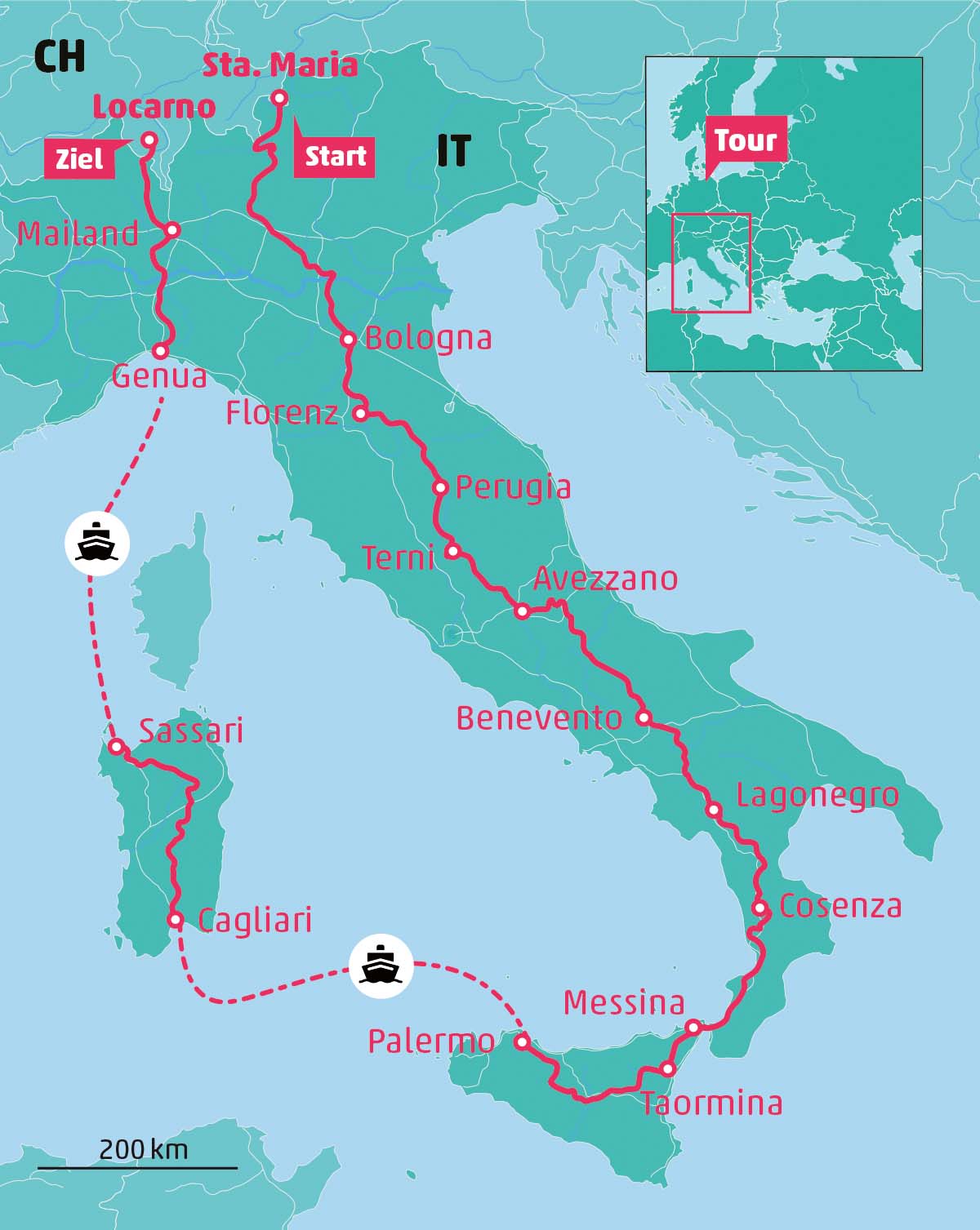 Erst durch Italiens Stiefel hinunter, dann über Sizilien und Sardinien zurück nach Norden – eine Achterbahn durch zwölf Regionen. Braucht es mehr zum Veloglück?