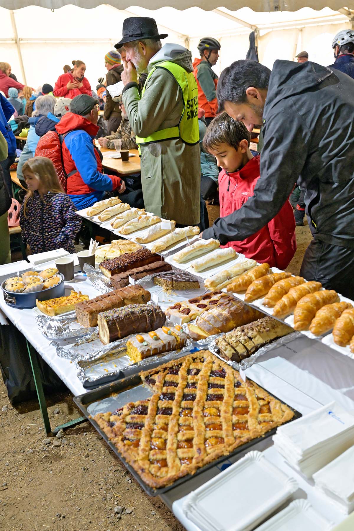 Unter all diesen Anlässen ist das Hombiquer der Lieblingsanlass eines Gravel-Fahrers: «Bestes Startgeld-Kuchenbuffet-Verhältnis weit und breit», schwärmt er. Die Stargebühr beträgt bescheidene 25 Franken, das Buffet ist tatsächlich legendär: Dutzende selbst gemachte Torten, Cakes und Nussgipfel warten in der «Schür» auf die hungrigen Velofahrer. In der Festwirtschaft duftet es aber nicht nur nach Backwaren, sondern auch nach Bratwurst, Glühwein und nassem Hund. Kinder leeren lachend ihre Gummistiefel aus, Jugendliche wärmen ihren Cervelat am Heizstrahler, man philosophiert über «Sand in der Ritze», es trifft Sport auf Dorffest, Pulsgurt auf Kafi Güx.