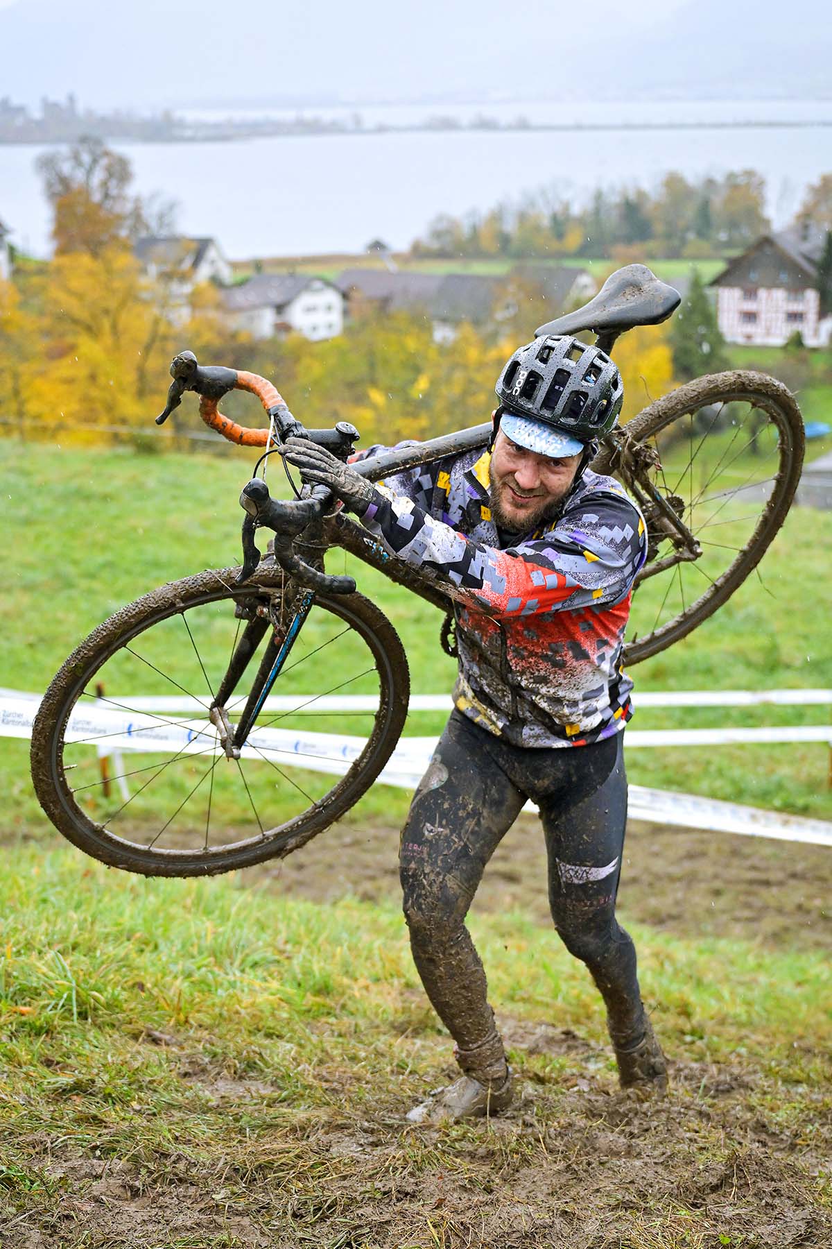 Das traditionsreiche Hombiquer ist und bleibt nämlich ein Sportanlass. Die Stimmung ist herzlich, kollegial und trotzdem ehrgeizig. Man hilft sich gegenseitig, feuert sich an – und zieht sich notfalls gegenseitig aus dem Dreck. Wortwörtlich: Als ich in einer Kurve fast wegrutsche, packt mich ein Mountainbiker kurzerhand am Ellbogen und bringt mich wieder auf die Strecke. Später begegnen wir uns wieder, als wir nebeneinander unsere Räder die schlammige Wiese hochstossen. Rennen, Schieben und Tragen gehören genauso zum Radquer, auch bekannt als Cyclocross, wie das Pedalieren.