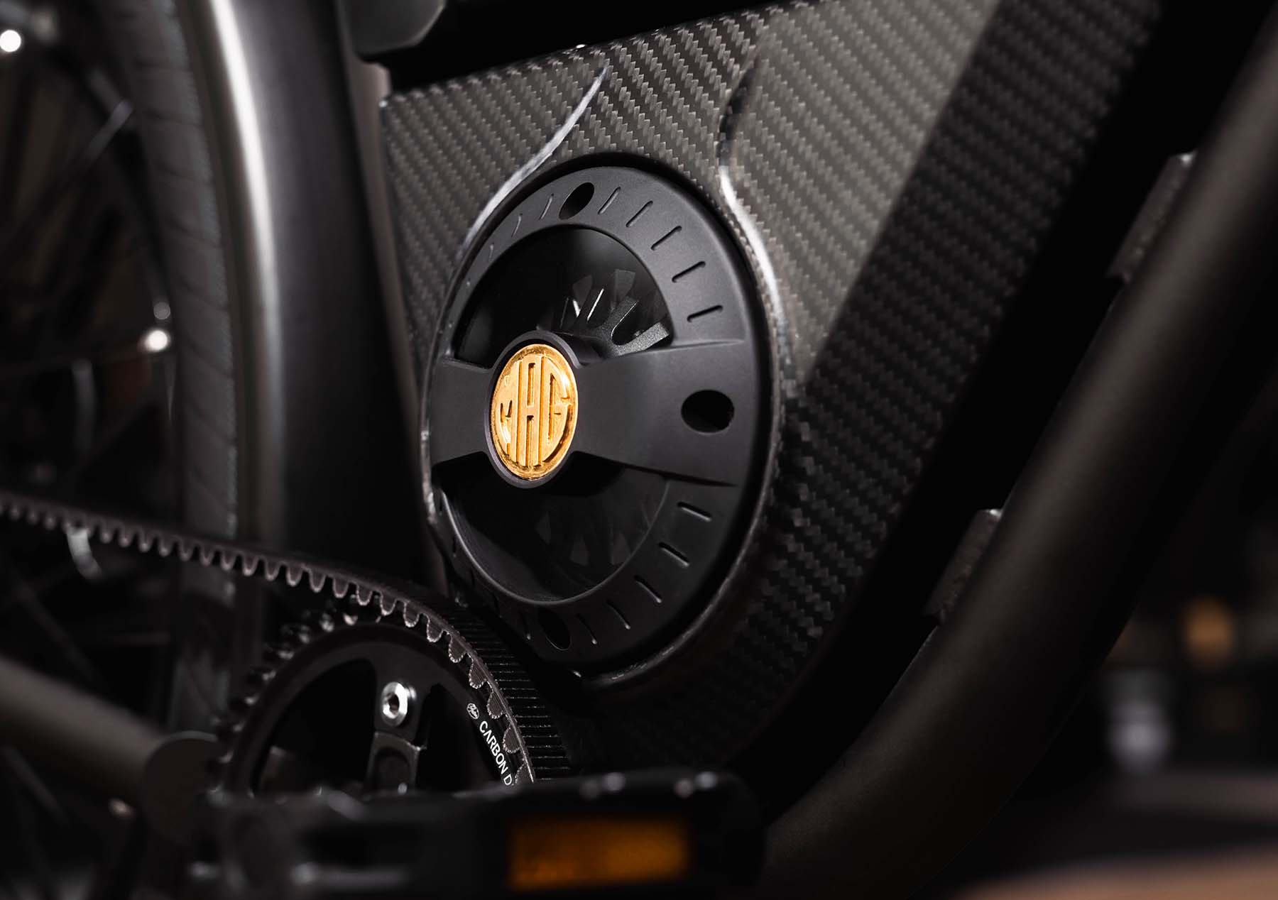 Klar, dass eine so edle und traditionsreiche Marke nicht einfach einen Antrieb ab Stange verbaut, sondern einen eigenen – wieder «MAG» genannt; der bürstenlose Synchron-Motor gehört mit 1000 Watt nicht nur zu den stärksten für S-Pedelecs – er weist vor allem eine ungewöhnliche Outrunner-Bauart auf: Weil sich der Rotor um seine Achse dreht (und nicht andersrum wie üblich) ist er sehr effizient und bietet noch einen optischen Bonus: Durch ein Glas sind die Umdrehungen sichtbar – eine Anspielung auf ein Schweizer Uhrwerk mit Glasboden.