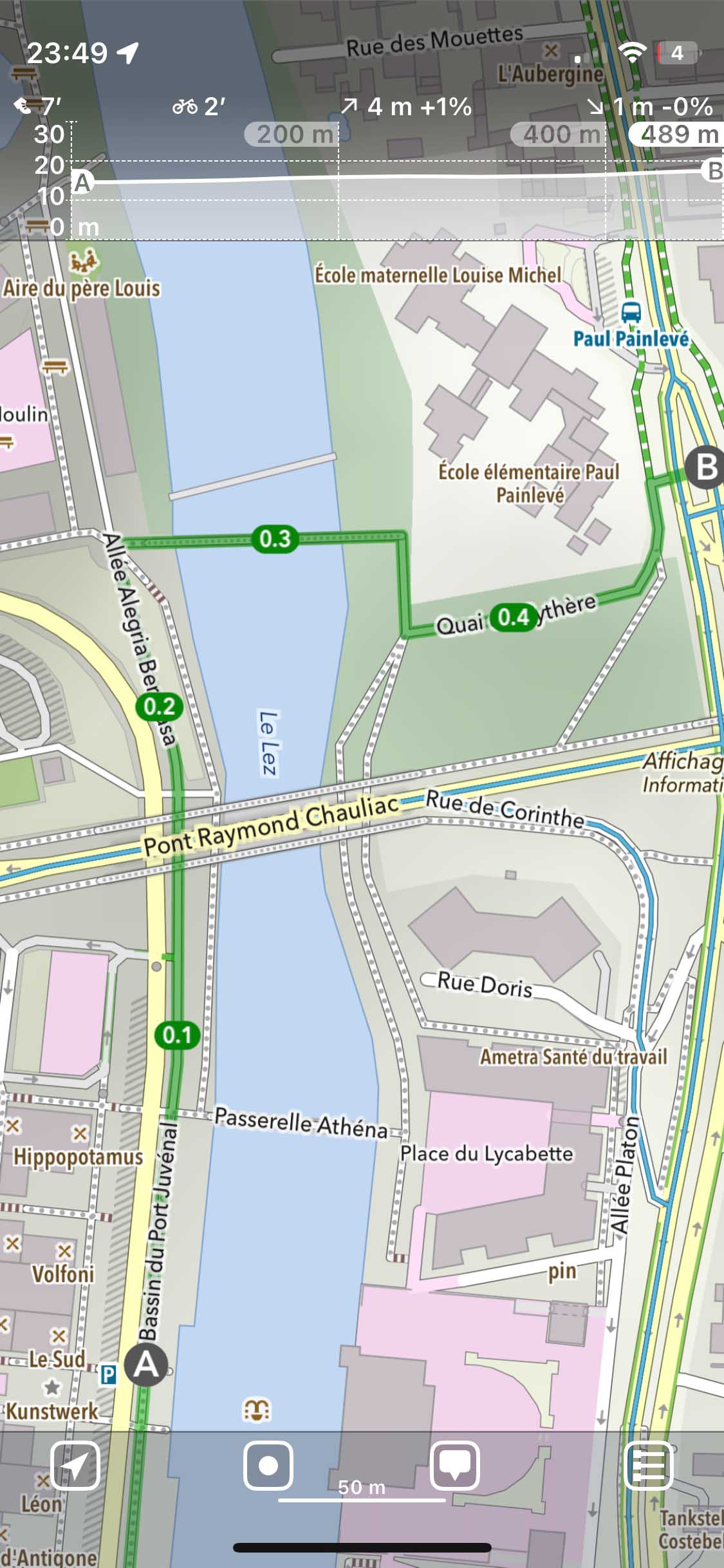 Für eine detaillierte Planung und Analyse bietet MapOut Informationen wie Höhenprofil, Distanz, Höhenmeter (Auf/Ab), Wander- und Veloreisezeit. Sogar die aktuelle Fahrgeschwindigkeit und Höhe über Meer werden angezeigt.