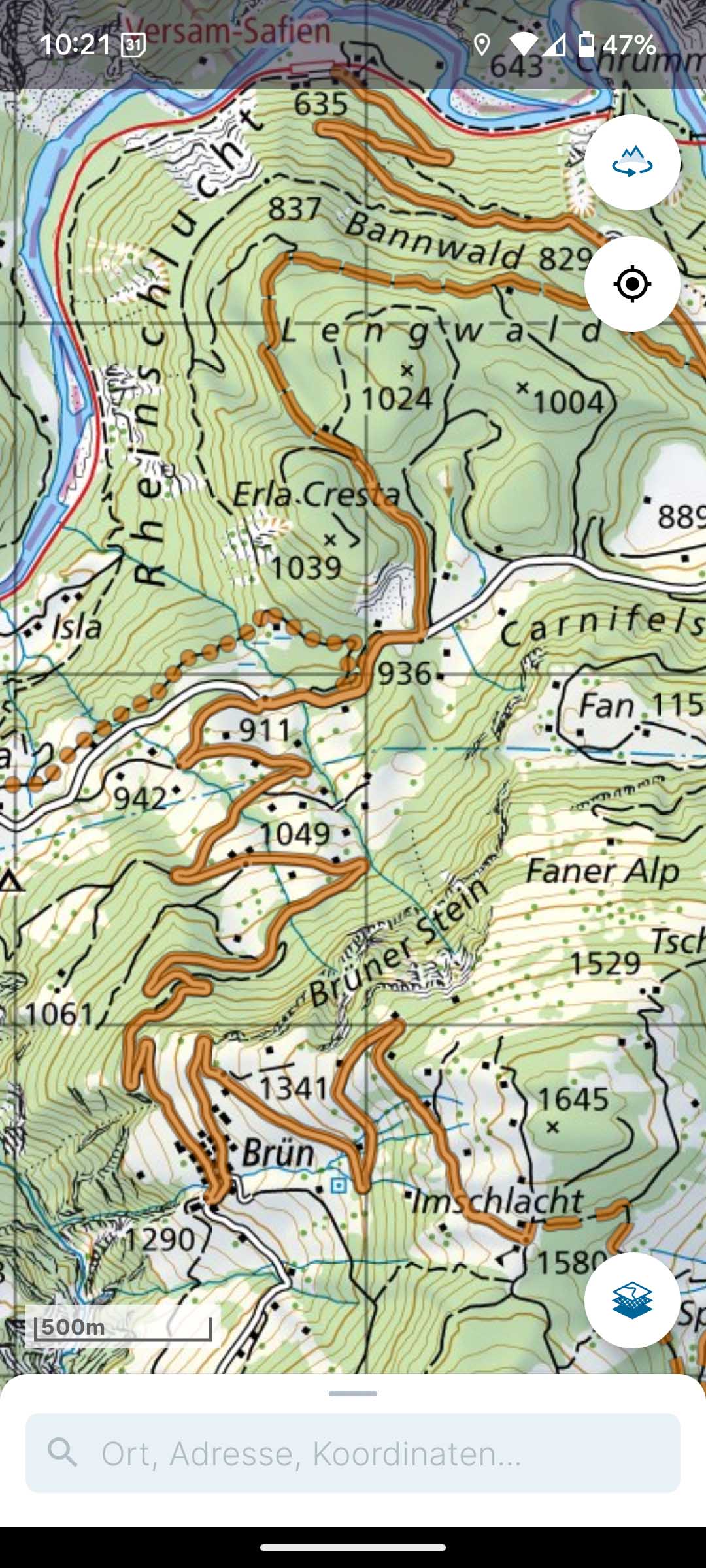 • Das Veloland- und Mountainbike-Land-Streckennetz von SchweizMobil kann als Layer eingeblendet werden, und der Panorama-Modus hilft, die Landschaft visuell zu erfassen.