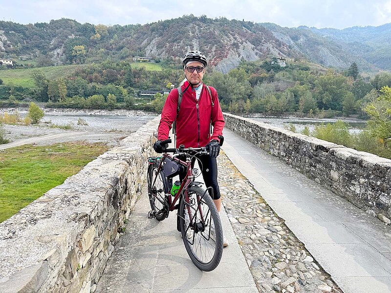 Der Autor auf der historischen Bogenbrücke bei Bobbio, die drei Bezeichnungen hat: Ponte Gobbo, Ponte Vecchio und Ponte del Diavolo.