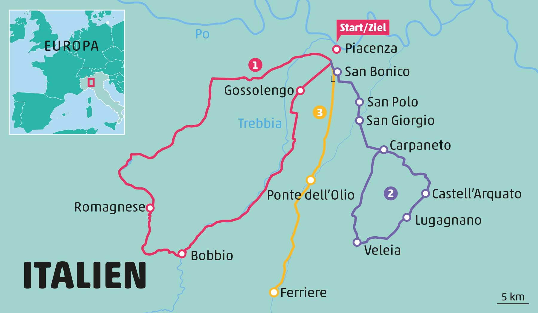 Die erste Ringvelotour beginnt beim Stadion des Fussballclubs Piacenza und verläuft dem Fluss Trebbia entlang. Ein Klassiker mit moderater Steigung. Der amerikanische Schriftsteller Ernest Hemingway beschrieb das Val Trebbia mit den Worten: «Es ist das schönste Tal der Welt» und gar als «das Paradies auf Erden». Die Zeiten haben sich jedoch geändert. Zweifelsohne ist der Regionalpark für Wandernde eine Möglichkeit, der Stadthektik zu entfliehen. Auf dem Velo ist die Fahrt auf der stark befahrenen Strasse (Strada Statale 45) jedoch ein mühsames Unterfangen.