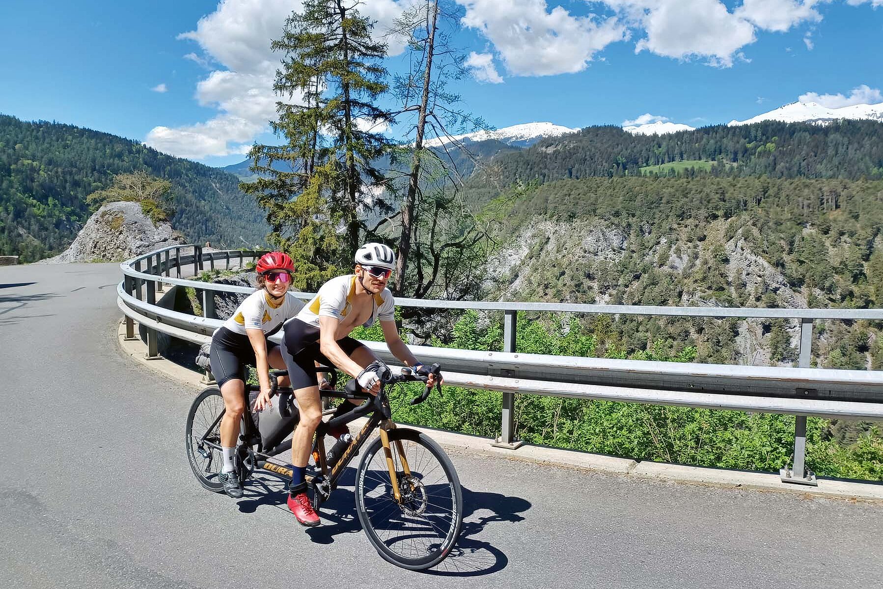 Am nächsten Morgen geht es nach einem Caffè und Gipfeli los: Jelena und Maxence auf ihrem, Aline und Alex auf dem zweiten Tandem. Begleitet von bestem Wetter überqueren wir den Lukmanierpass – an sich schon eine Herausforderung mit seinen knapp 1700 Höhenmetern, und das noch mit Tandem und Gepäck. Nach diesem langen Anstieg fühlt sich die Fahrt durch die Rheinschlucht fast wie Fliegen an. Mit einem Abstecher nach Liechtenstein und einem herrlich sommerlichen Tag im Toggenburg erreichen wir schliesslich Zürich.
