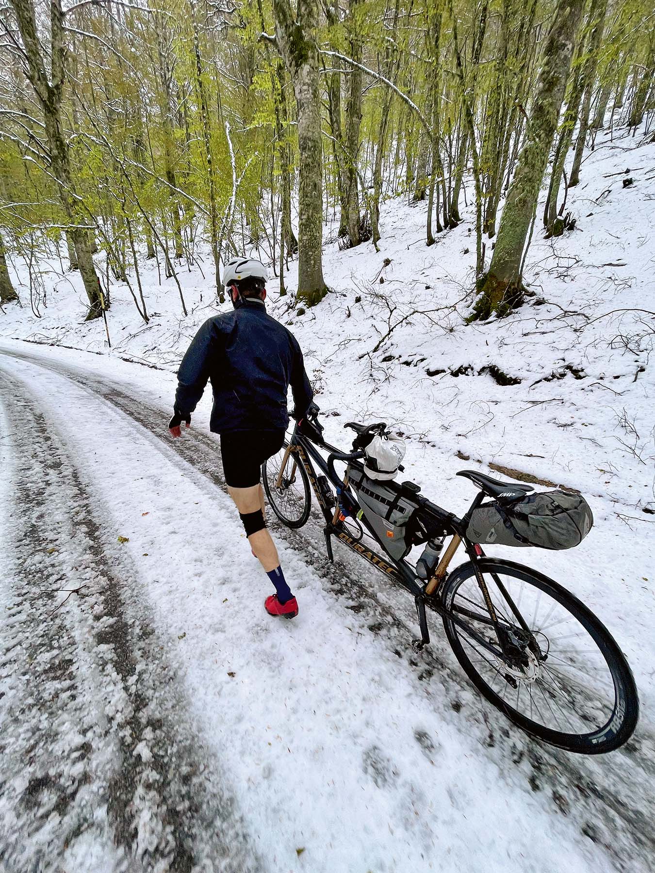 Als die Sonne wieder scheint, werden unsere Beine unruhig. So erklimmen wir die Passstrasse am Monte Pollino guter Dinge und bei schönstem Wetter. Oben angelangt, wird der Himmel plötzlich grau, es wird windig und immer kälter. Die Temperatur kommt der Nullgradgrenze gefährlich nahe, Schneeflocken stechen unsere nackten Waden. Die Strasse wird immer verschneiter und vereister, sodass wir irgendwann vom Tandem steigen und laufen müssen. Unsere Kleidung ist für den kalabrischen Frühling ausgelegt, nicht für 2 Grad Celsius und Schnee.
