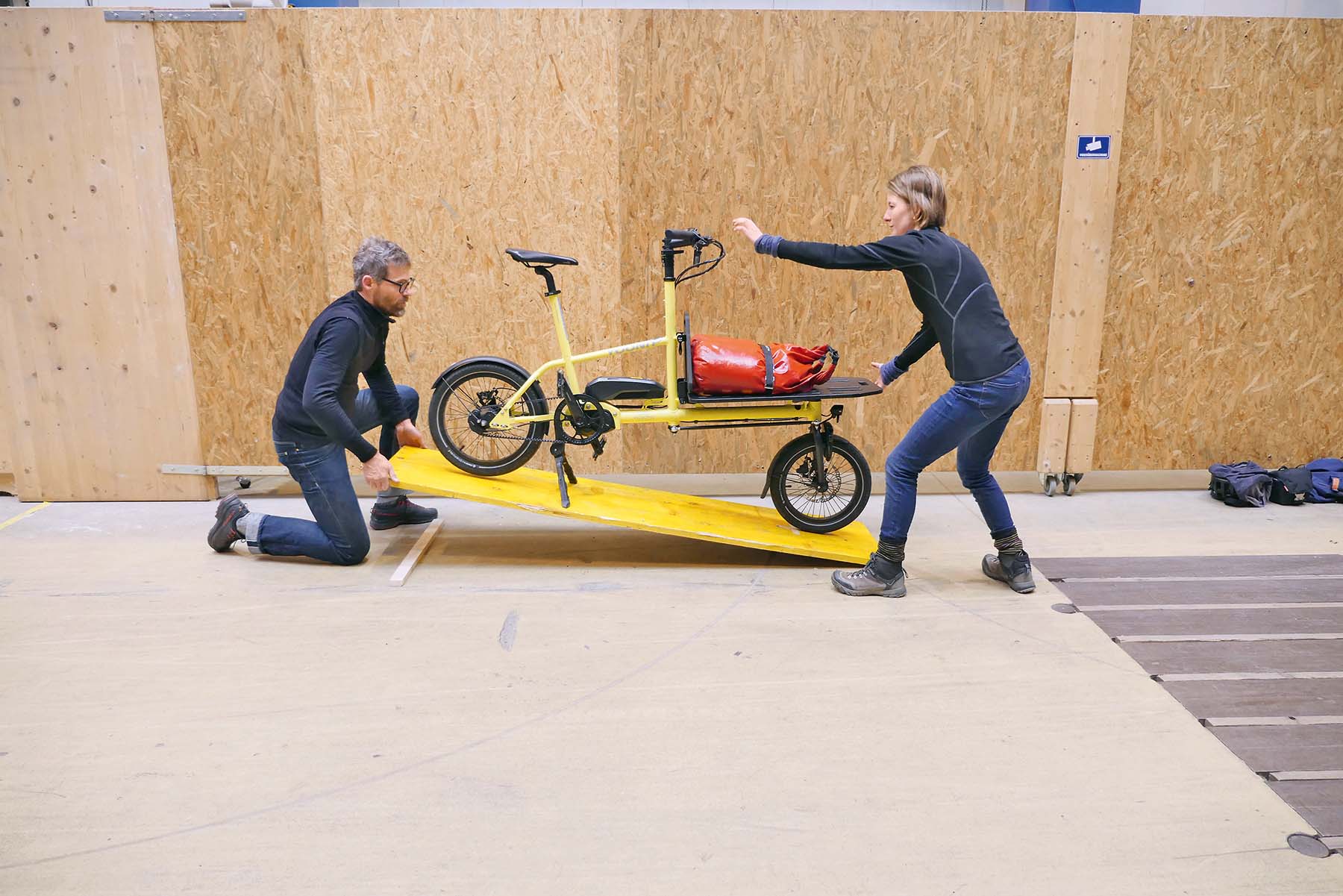 Welche Einflüsse eine Beladung von 20 kg auf das Fahrverhalten haben kann, zeigt die Bergfahrt. Leer pedaliert es sich mit allen Micro-Cargobikes recht angenehm die 15 % steile Teststrecke hoch. Ganz anders sieht es aber aus, wenn mitsamt Ladung an dieser steilen Stelle angefahren werden muss. Auch im kleinsten Gang und der höchsten Unterstützungsstufe war es nicht allen Testpersonen möglich, mit den Modellen von Super Bicycles und Monopole in der Steigung anzufahren. Hierbei ist zu erwähnen, dass das «Super Mighty» bald mit einem stärkeren Motor in der Schweiz erhältlich sein soll.