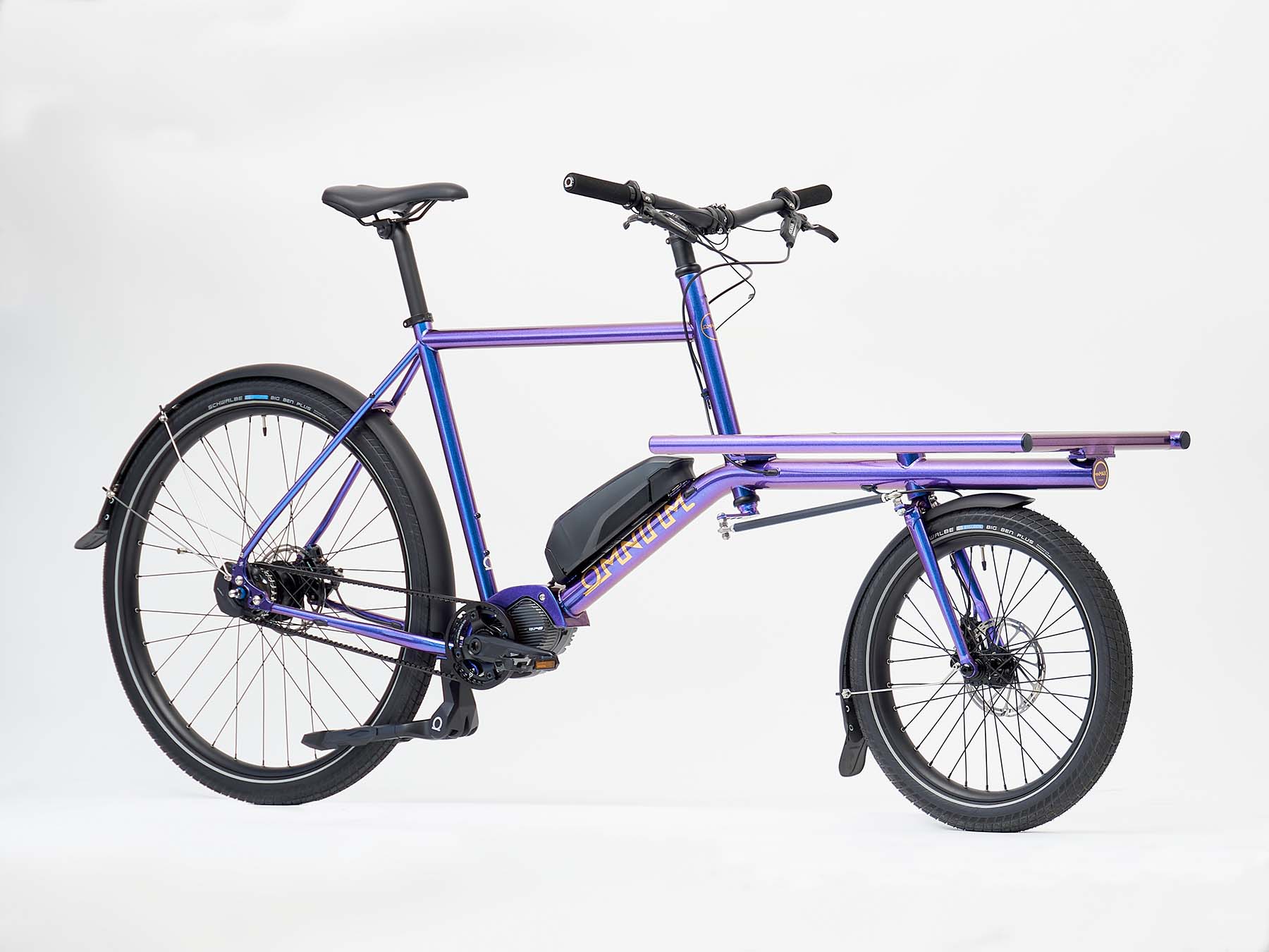 geschweisster Stahlrahmen mit Starrgabel, Hinterrad 20 Zoll, Vorderrad 16 Zoll, Shimano-«EP801 Cargo»-Mittelmotor, 504-Wh-Akku, Shimano-«Nexus 5»-Nabenschaltung mit Gates-Riemen, Schaltspektrum von 263 %
