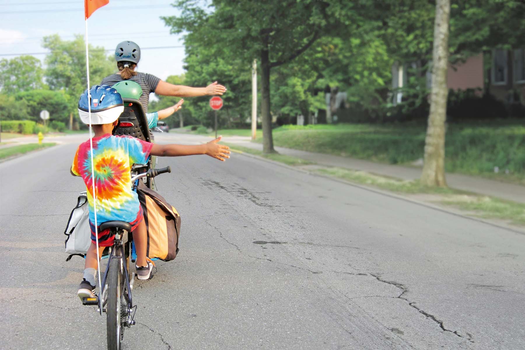 - Sicherheit geht vor: Besprechen Sie vor der Tour die Verkehrsregeln mit Ihren Kindern. Achten Sie darauf, dass alle hintereinander radeln und ausreichend Abstand zu geparkten Autos halten.