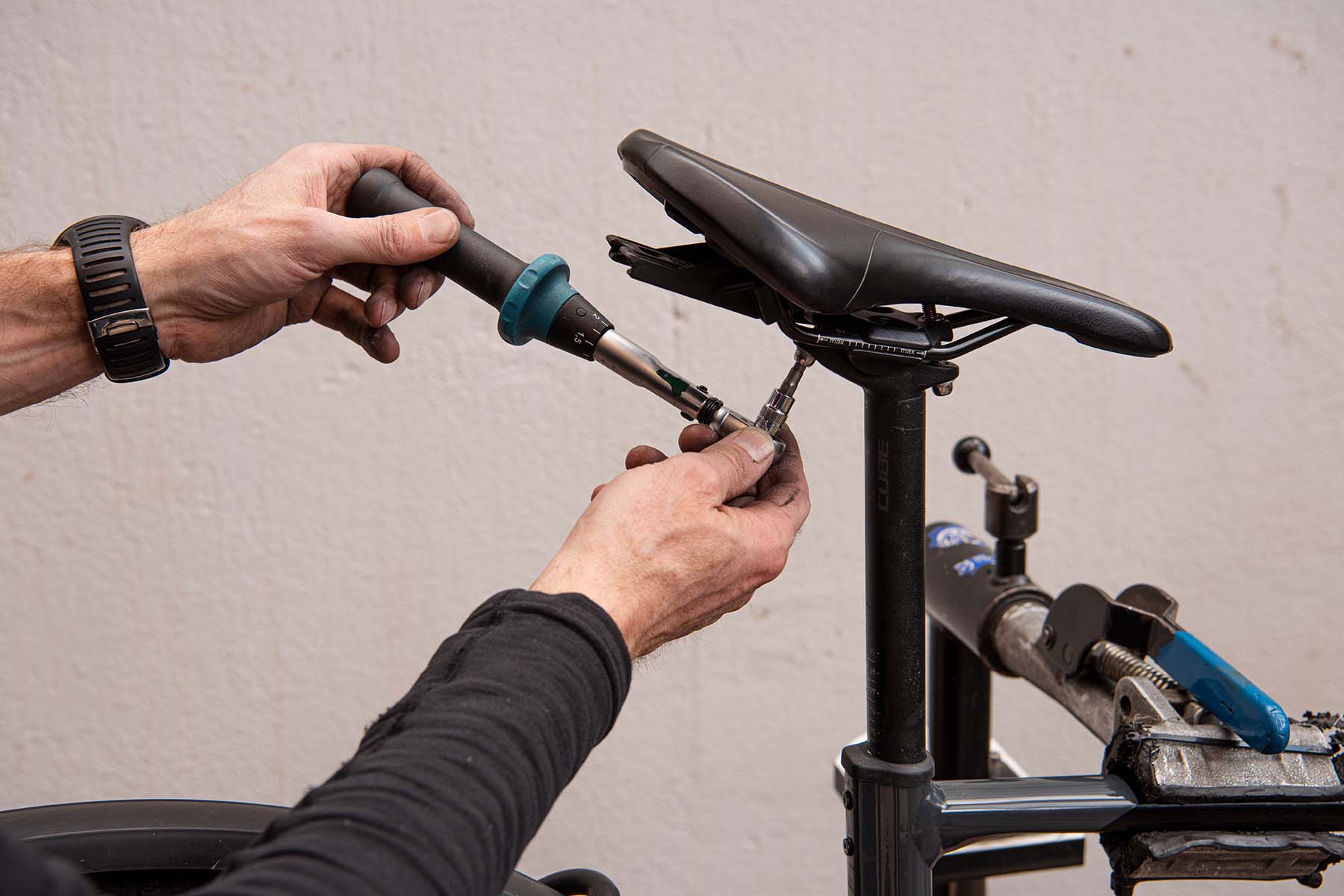Alle Schrauben auf festen Sitz überprüfen. Besonders wichtig sind die Schrauben unter dem Sattel, den Pedalen, Kurbeln, dem Lenkervorbau und Lenker. Bei Leichtgewicht- und Carbon-Teilen: Unbedingt einen Drehmomentschlüssel verwenden und die Schrauben mit dem exakten Wert anziehen. Ebenfalls die Radbefestigungen (Schnellspanner, Achsmuttern, Steckachsen) überprüfen.