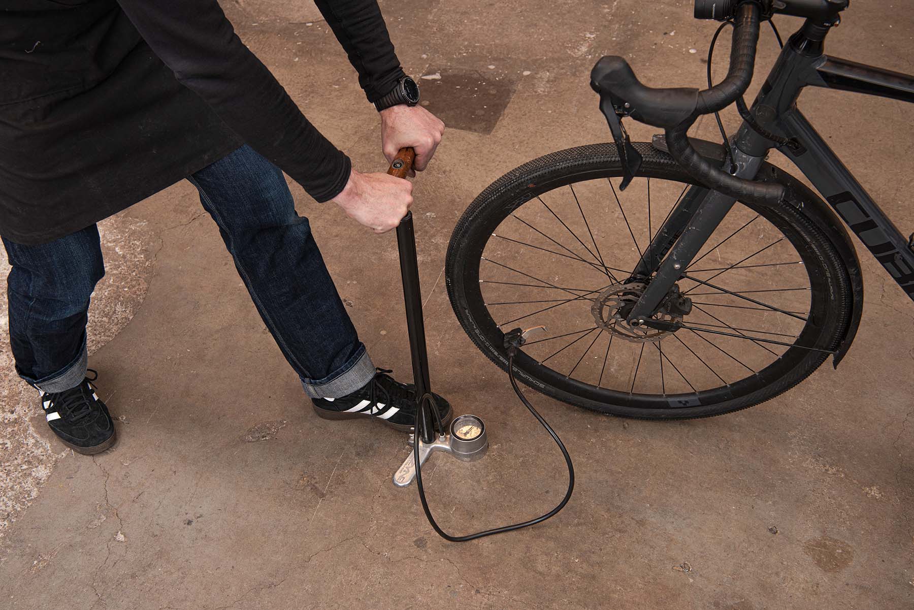 Reifen auf den korrekten Luftdruck pumpen. Dieser ist auf der Seitenwand der Reifen angegeben (muss meist etwas gesucht werden). Leichte Personen wählen eher den niedrigsten Wert, schwere Personen oder solche, die mit viel Last fahren, nehmen den Maximalwert.