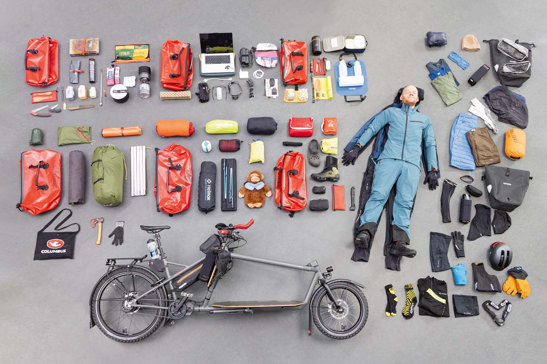 Das ist alles. Insgesamt sind das etwa 40 Kilogramm Gepäck, dazu kommen vier Akkus à 630 Wh. Verpackt habe ich das Ganze in sechs Packtaschen und einem Satz Gepäckträgertaschen.