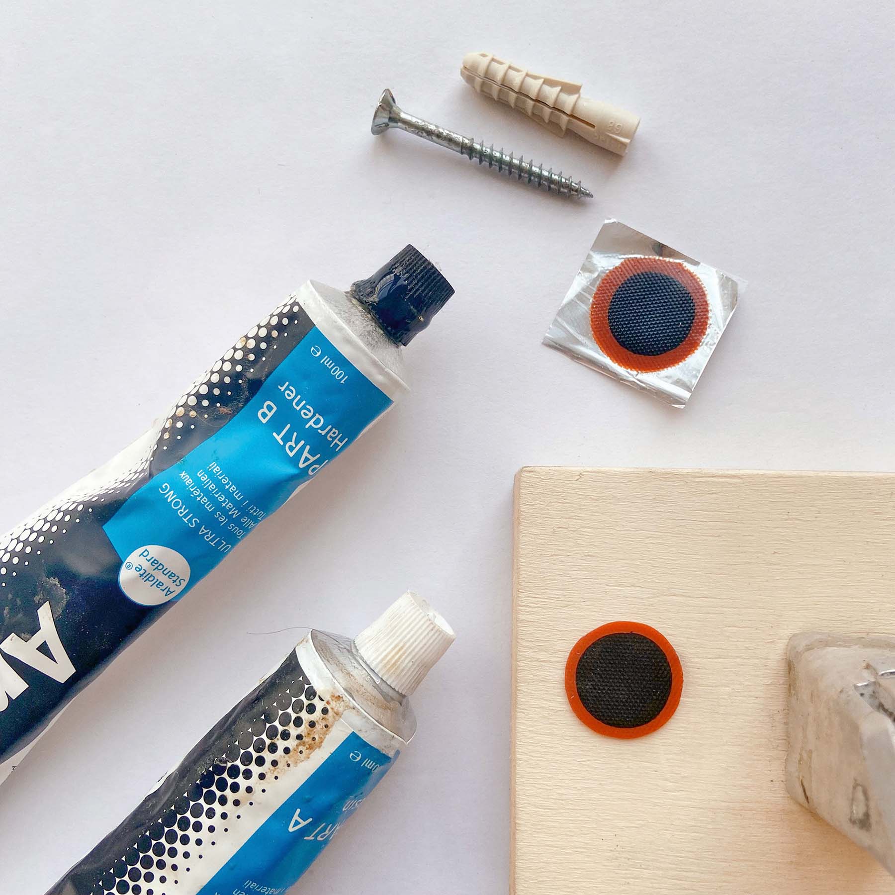 Retro-Bremshebel (nicht vernietet mit Schrauben), alte Ventile mit Ringli, metrische Schrauben mind. 50 mm mit passendem Durchmesser (abhängig von den im Lenkergriff verbauten Schrauben), metrische Schrauben ca. 40 mm mit passenden Muttern und Hutmuttern, Zweikomponentenkleber, Schlauchflicken