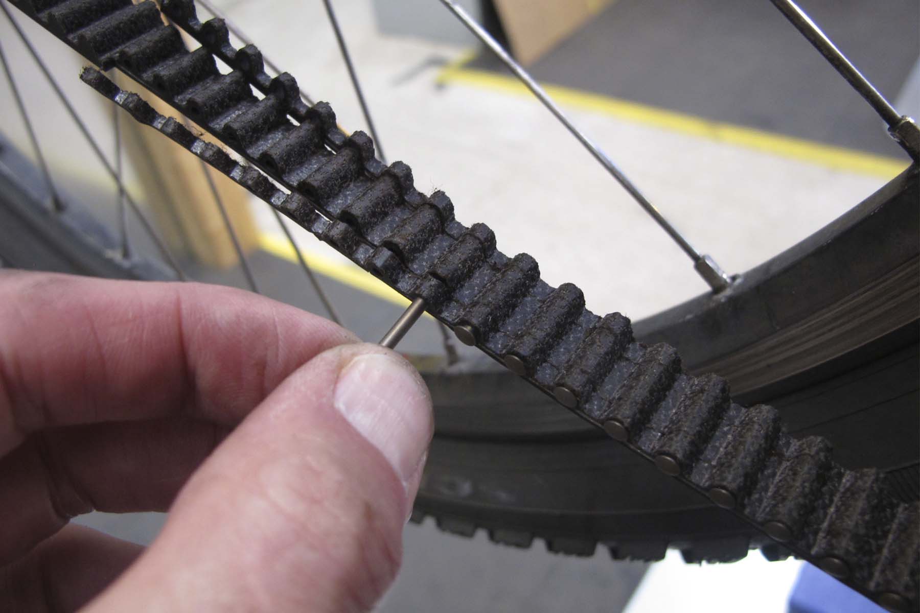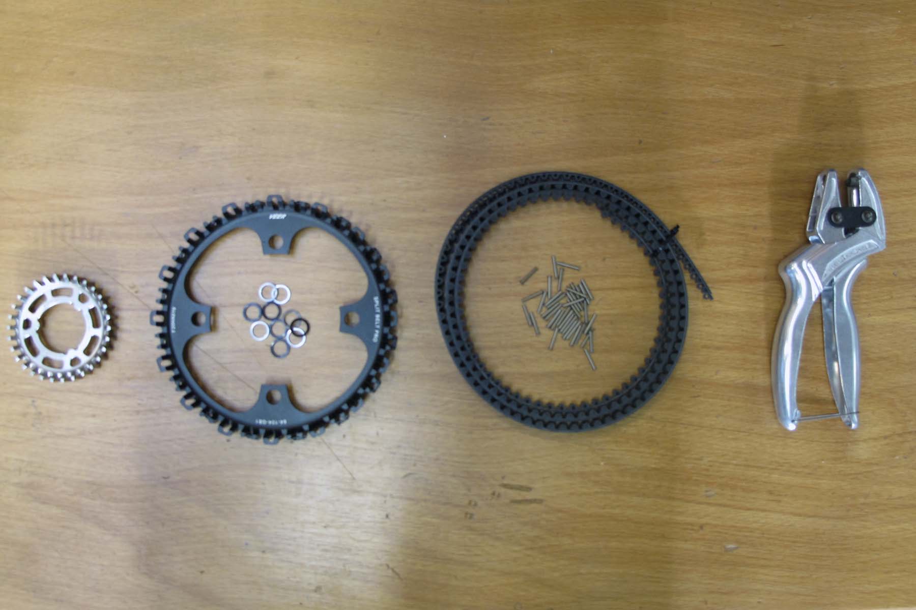 Der Umbau ging ohne Überraschungen von Statten. Nachdem die Riemenscheibe hinten auf der Shimano-«Alfine»-Nabenschaltung und die Riemenscheibe vorn auf der bestehenden Kurbel anstelle des Kettenblattes montiert wurde, konnte der Riemen eingesetzt und mit den 35 Nietstiften verschlossen werden.