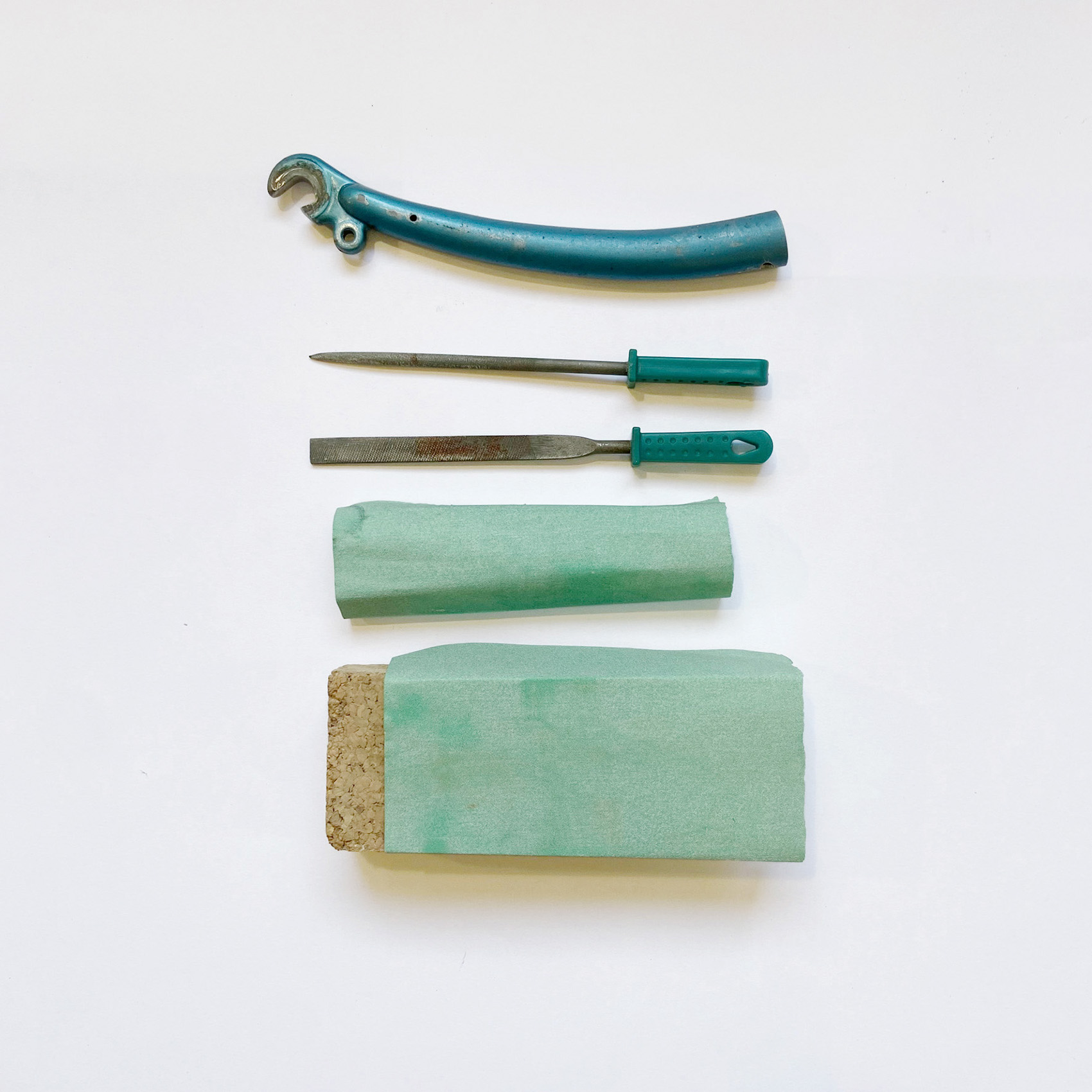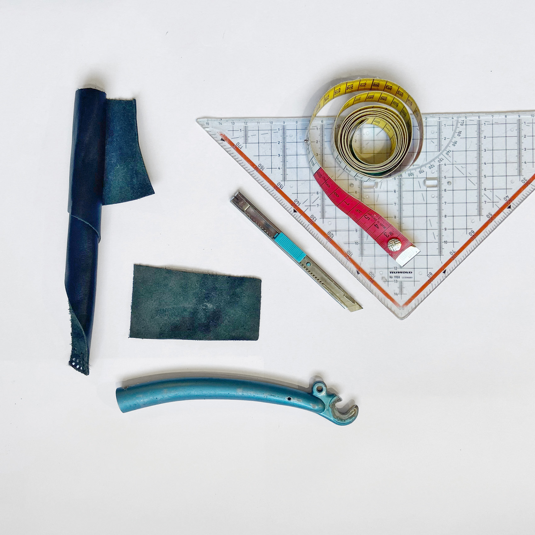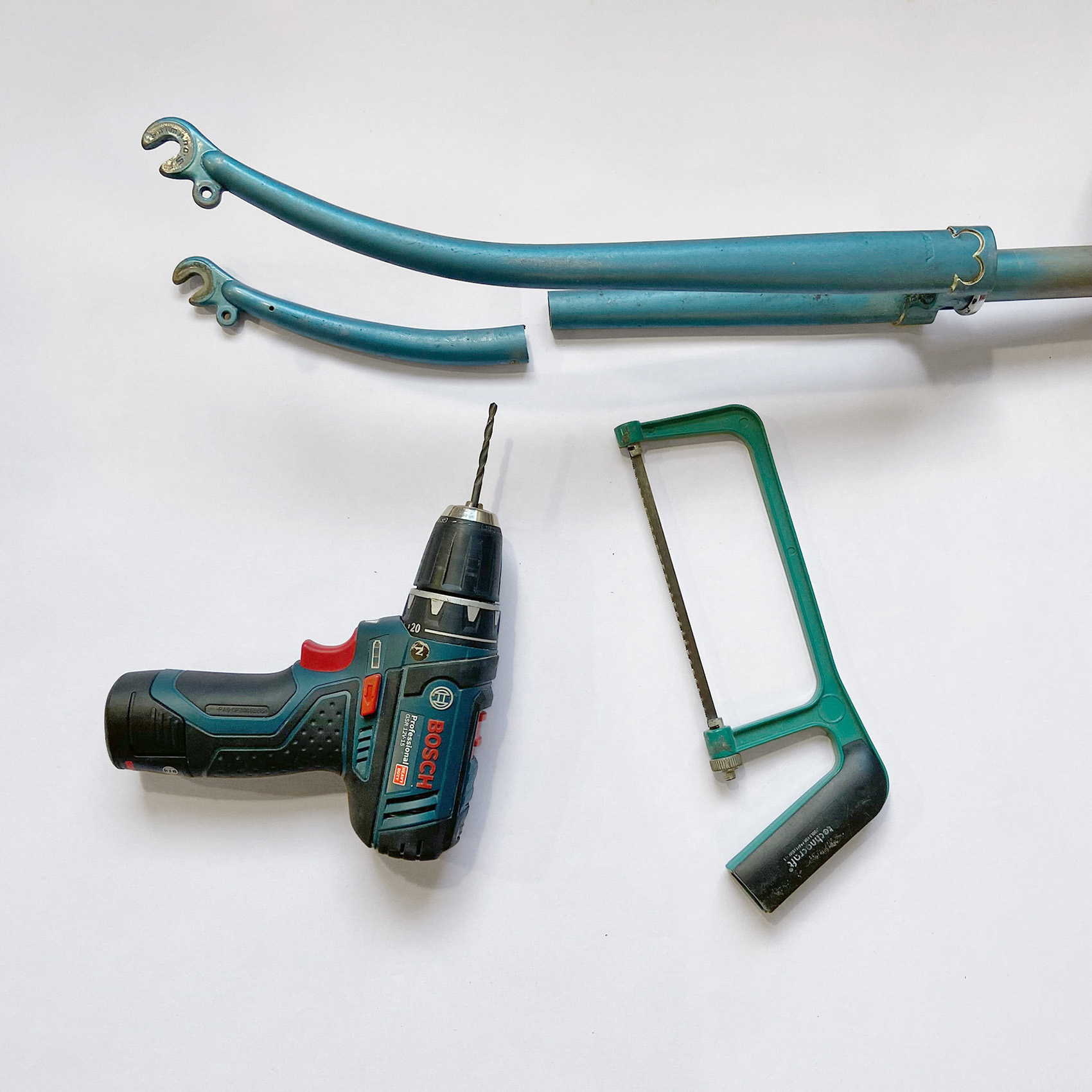 Metallsäge, Bohrer, Schleifpapier, Feile, Geodreieck, Massband, Lochzange, Filzstift