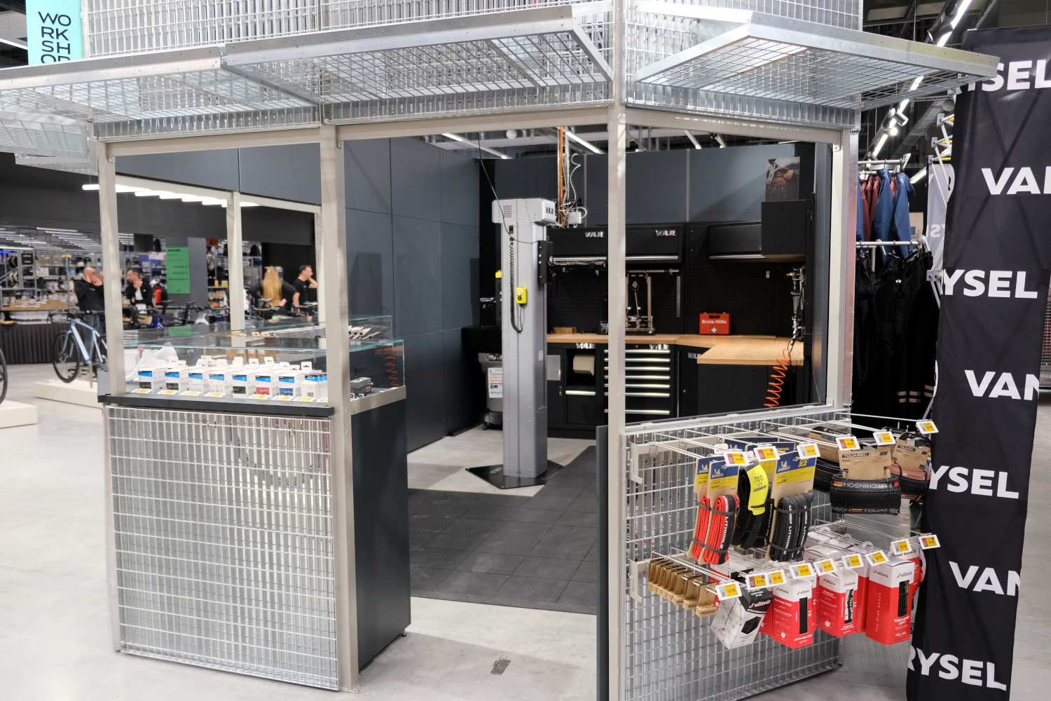 Von den Einbaumöbeln über den Montageständer bis zum Werkzeug kann sich die offen gestaltete Werkstatt des Van-Rysel-Stores sehen lassen.